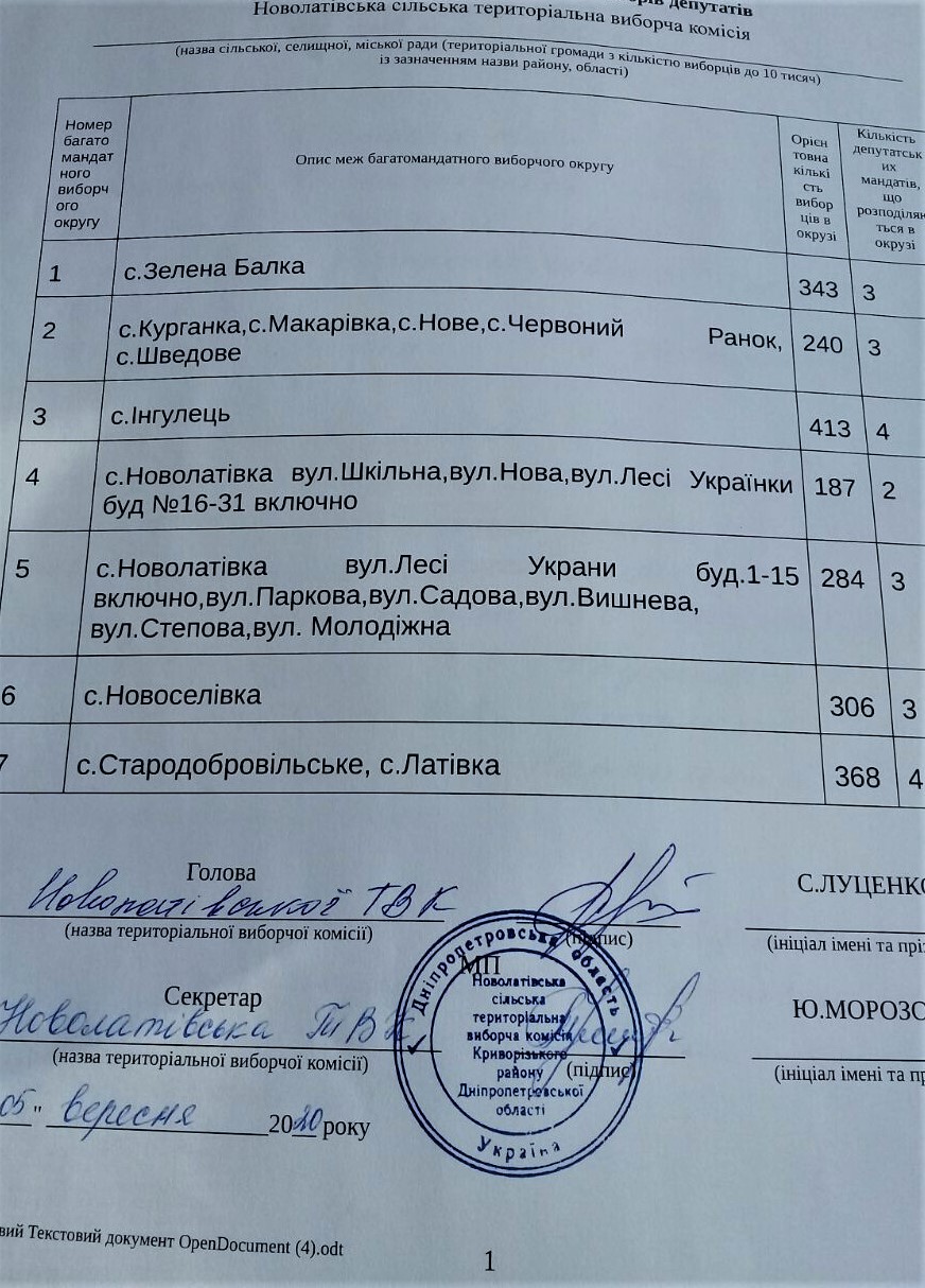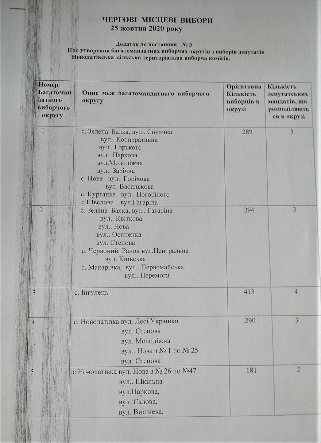 Також 11 вересня члени Новолатівської ТВК на засіданні, яке, зі слів ексголови Сергія Луценка, не мало кворуму (5 членів з 12 з’явилися вперше), внесли зміни до постанови №2 від 5 вересня 2020 року про утворення багатомандатних виборчих округів. Були змінені межі округів №1, №2, №4, №5. Згідно з Додатком до Постанови №3 с. Зелена Балка виявилося розірваним між округами №1 та №2. У постанові від 5 вересня, коли головою комісії ще був Сергій Луценко, с. Зелена Балка входило повністю до округу №1.