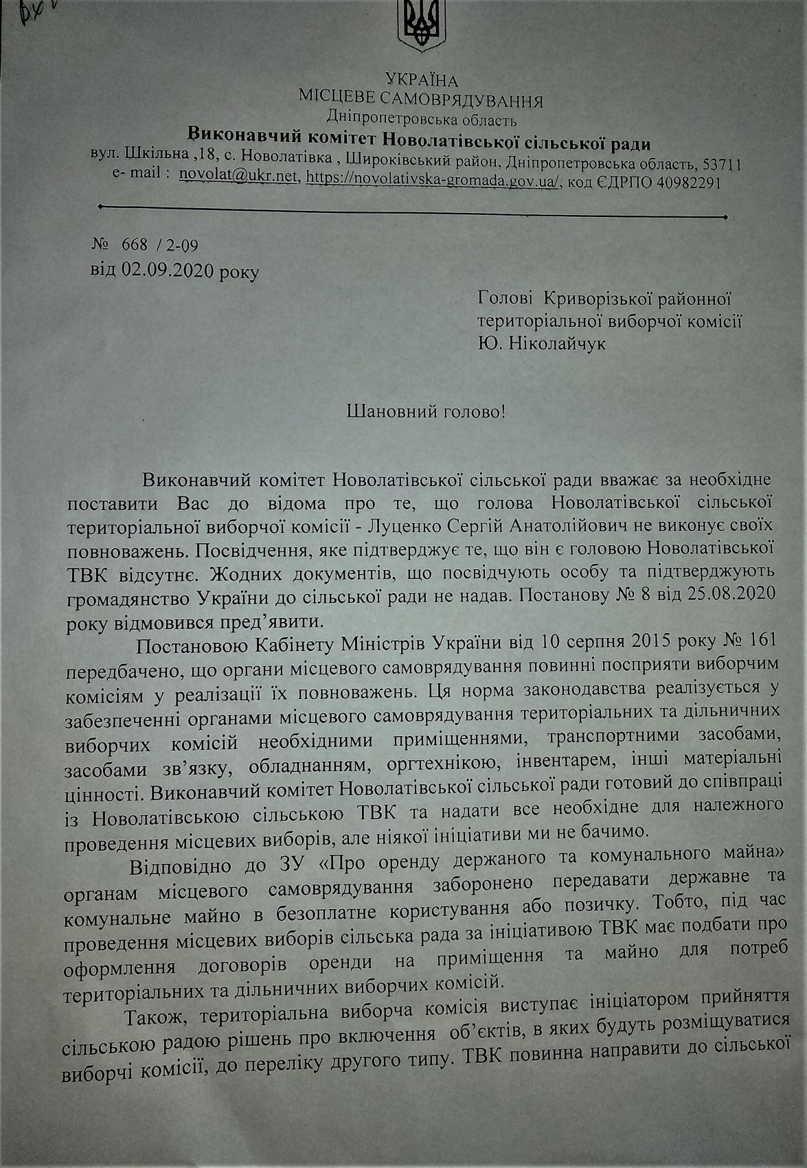 Голова Новолатівської сільської виборчої комісії Сергій Луценко від початку роботи комісії звертався до голови Новолатівської сільської ради Олександра Зубрія щодо матеріально-технічного забезпечення та забезпечення охорони приміщення виборчої комісії. 9 вересня Сергій Луценко написав заяву до Криворізької районної ТВК щодо відсутності матеріально-технічного забезпечення, що є перешкоджанням роботі ТВК з боку органів місцевого самоврядування. Того ж дня голова Новолатівської сільської ради Олександр Зубрій також звернувся до Криворізької районної ТВК із заявою, в якій йдеться про те, що голова комісії Сергій Луценко не виконує свої посадові обов’язки. Нібито голова комісії не надав жодних документів, які засвідчують його особу.