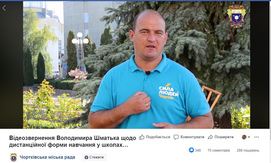 14 вересня на офіційній сторінці Чортківської міської ради з’явився допис із відеозверненням Володимира Шматька щодо дистанційної форми навчання у школах громади. На ньому видно, що чинний голова міста був одягнутий у футболці з логотипом політичної партії «Сила Людей».