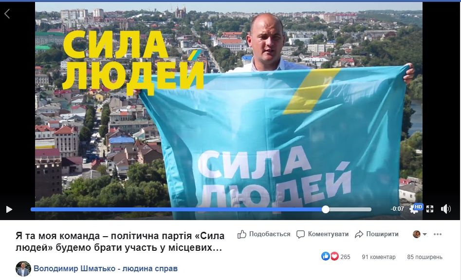 Поза тим 8 вересня на сторінці «Володимир Шматько - людина справ» у соціальній мережі Facebook було оприлюднено відеоролик з підписом «Я та моя команда – політична партія «Сила людей» будемо брати участь у місцевих виборах». У ньому чинний мер Чорткова, тримаючи прапор з логотипом партії «Сила Людей», повідомив про свій намір балотуватися на місцевих виборах 25 жовтня. Своє звернення він завершив словами: «Будь ласка, прийдіть на місцеві вибори, підтримайте нашу команду, політичну партію «Сила Людей». І разом з Вами ми змінимо наш Чортків. З повагою ваш міський голова».
