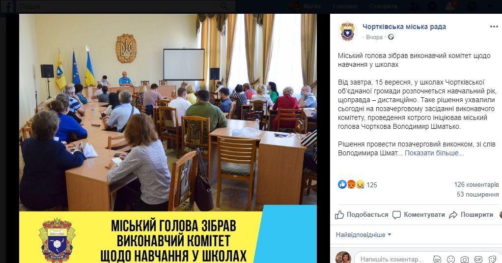 Того ж дня на сторінці Чортківської міської ради був опублікований інший допис про засідання виконавчого комітету щодо навчання у школах громади. На доданому до повідомлення зображені видно, що на зустрічі чинний міський голова Володимир Шматько був одягнений у футболку схожого стилю та кольорів. За інформацією із офіційного сайту міської ради на засіданні також були присутні директори шкіл Чортківської громади.
