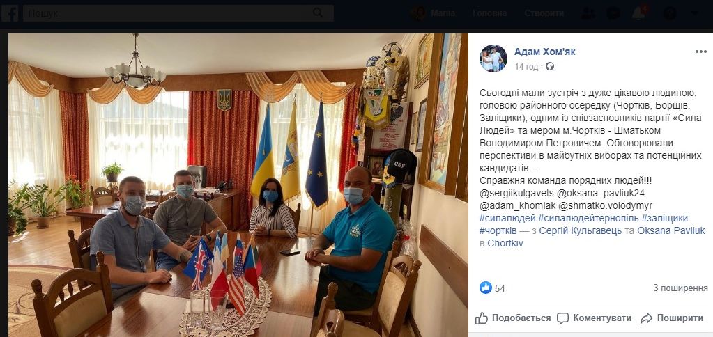 Також 14 вересня на особистій сторінці у соціальній мережі Facebook представника Заліщицького місцевого осередку політичної партії «Сила людей» Адама Хом'яка з’явився допис. У ньому йшлося про зустріч з головою районного осередку (Чортків, Борщів, Заліщики) партії «Сила Людей» - Володимиром Шматьком. Публікація містила фото зустрічі, яка відбулася у кабінеті міського голови Чорткова. На фото видно, що мер був одягнений у футболку з логотипом партії.