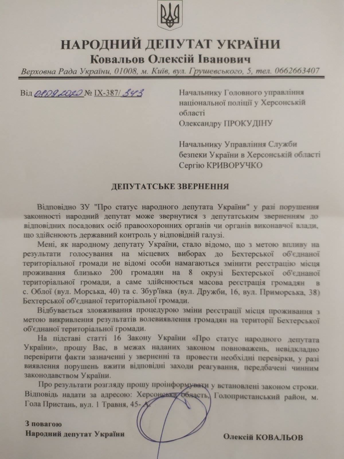 На масову зміну виборчої адреси звернув увагу народний депутат України Олексій Ковальов. На офіційній сторінці у Facebook Ковальов опублікував депутатське звернення до начальника головного управління національної поліції у Херсонській області та начальника Управління Служби Безпеки України в Херсонській області. У зверненні депутат наголошує: «Мені, як народному депутату України, стало відомо, що з метою впливу на результати голосування на місцевих виборах до Бехтерської об’єднаної територіальної громади невідомі особи намагаються змінити реєстрацію місця проживання близько 200 громадян на 8 окрузі Бехтерської об’єднаної територіальної громади, а саме здійснюється масова реєстрація громадян в с. Облої (вул. Морська, 40) та с. Збур’ївка (вул. Дружби, 16, вул. Приморська, 38) Бехтерської об’єднаної територіальної громади».