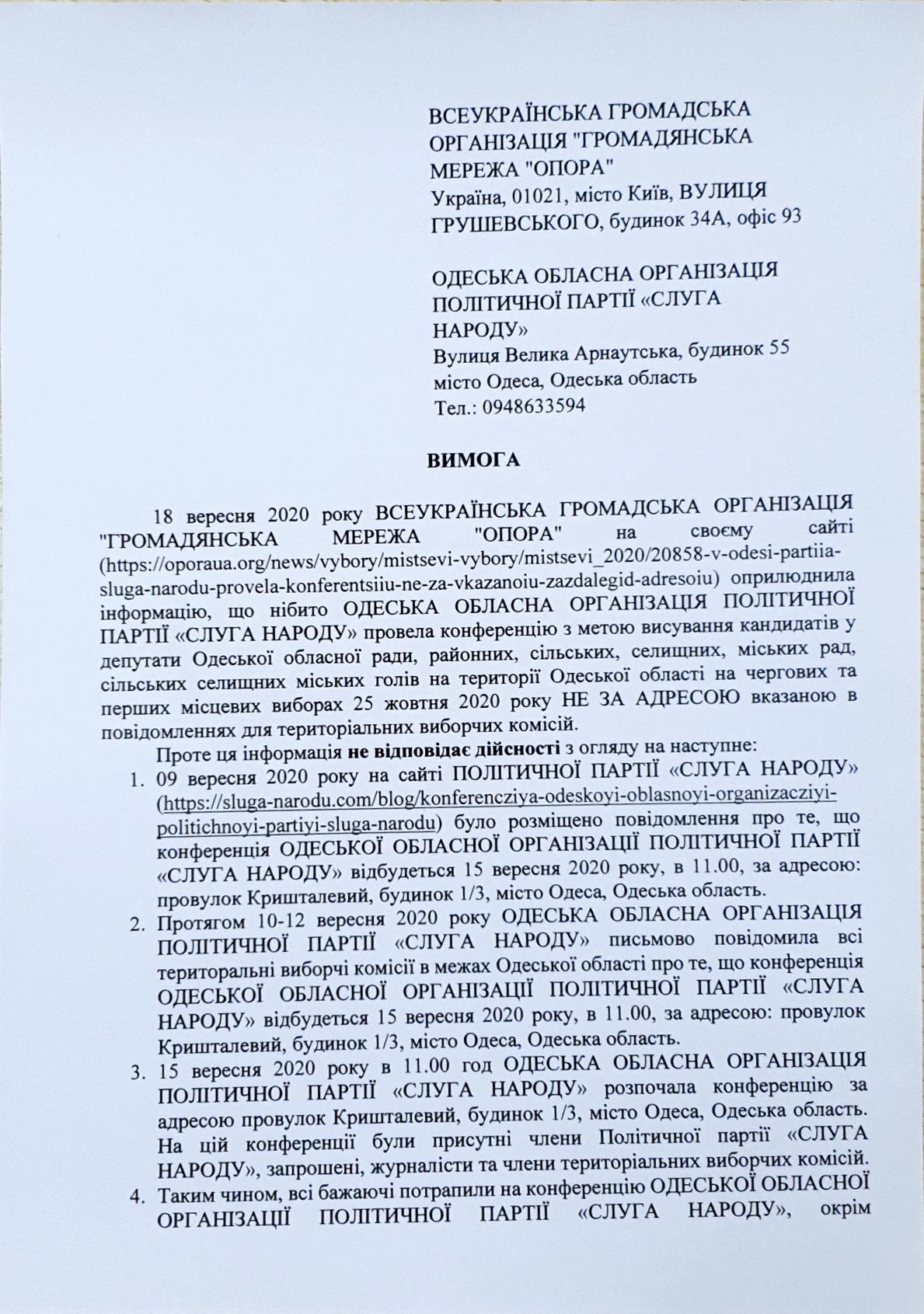 ОПОРА чітко стоїть на своїй позиції, яка була викладена в публікації, проте задля дотримання принципу публічності і відкритості виборчого процесу, публікує в порядку забезпечення права на відповідь листи голови Одеської обласної організації політичної партії “Слуга народу” Сергія Колебошина.