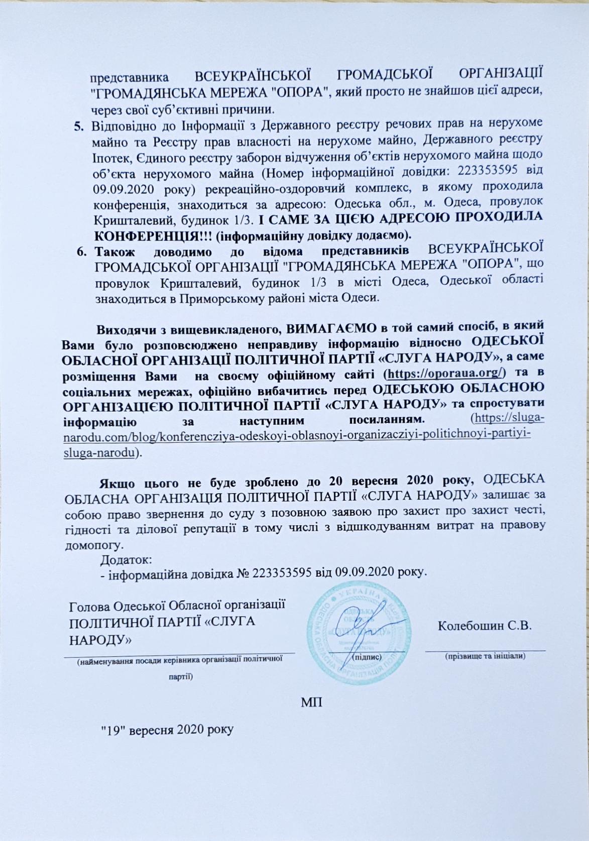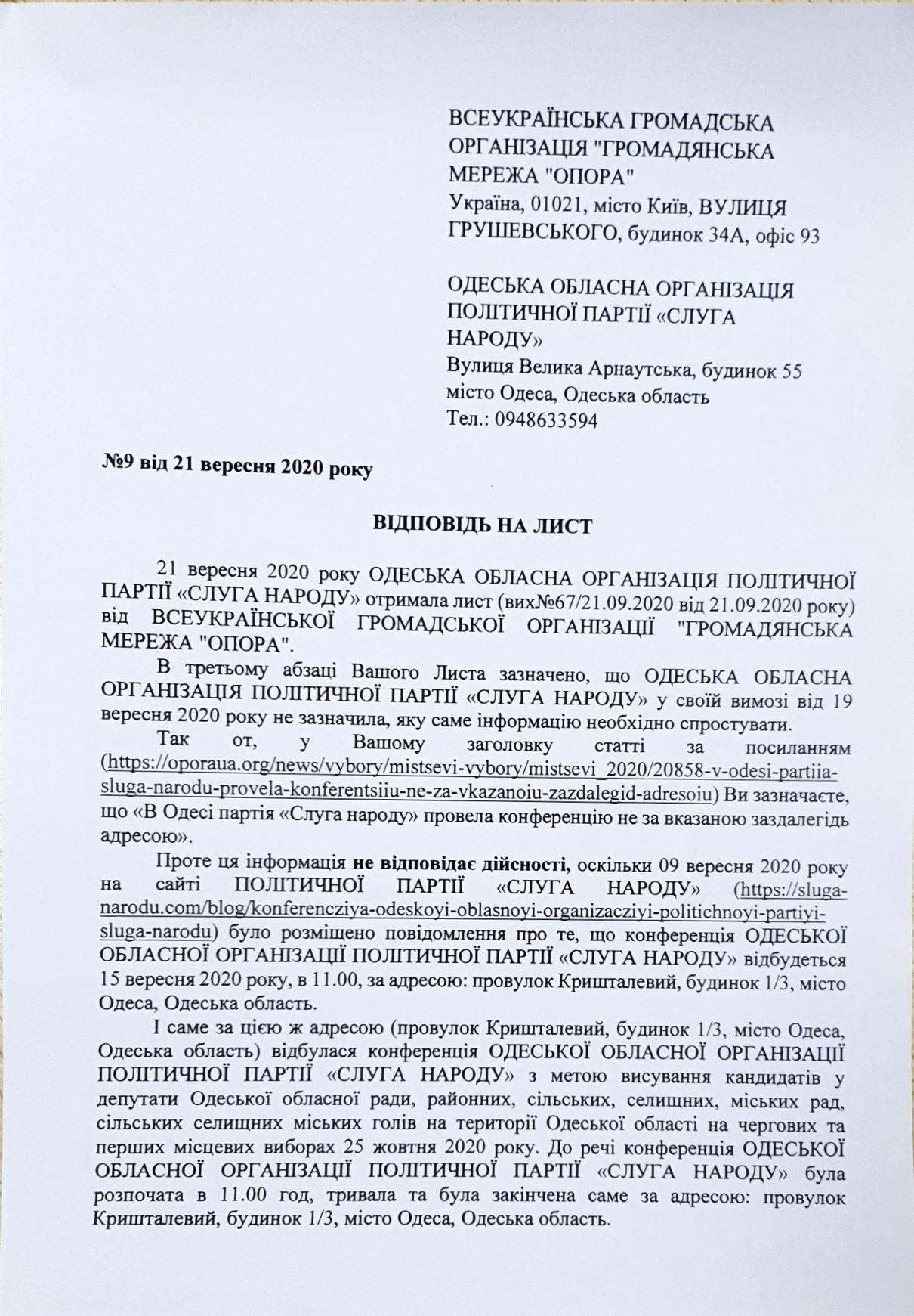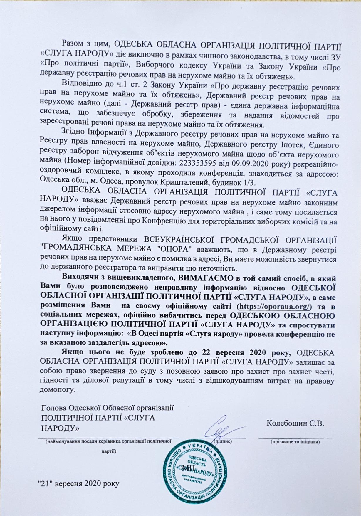 Після виходу даної публікації до ОПОРИ звернувся голова Одеської обласної організації політичної партії “Слуга народу” Сергій Колебошин та надав документ, який, за його твердженням, підтверджує факт проведення конференції за адресою: м. Одеса, провулок Кришталевий, 1/3. Цим документом була інформаційна довідка з Державного реєстру прав на нерухоме майно, Єдиного реєстру заборон відчуження об’єктів нерухомого майна, Державного реєстру іпотек від 9 вересня 2020 року. У своїх листах (яких було два, публікуємо нижче) голова обласної організації стверджує, що саме ця довідка є належним доказом адреси проведення конференції.