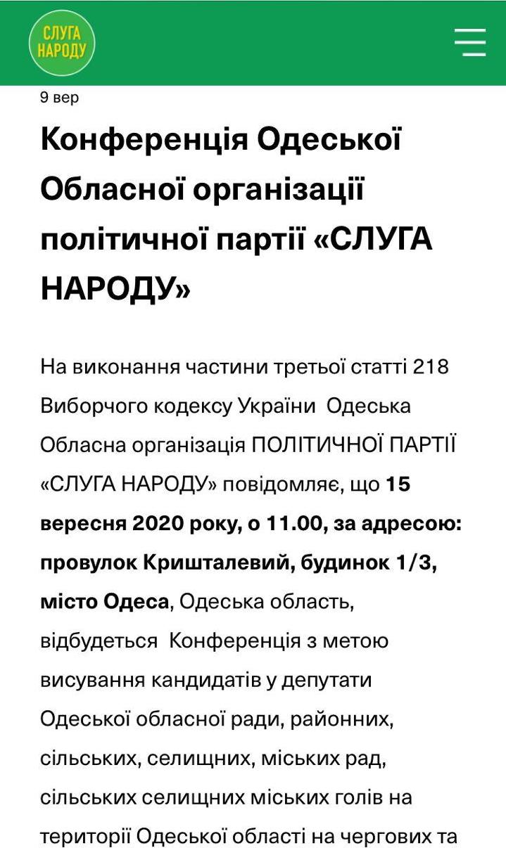 Як повідомляє ОПОРА, на офіційному сайті партії було опубліковано інформацію, що конференція обласної організації партії, на якій планувалося висунення кандидатів у депутати місцевих рад та на посади сільських, селищних і міських голів Одеської області, має відбутися об 11-й годині за адресою: провулок Кришталевий, 1/3, м. Одеса.