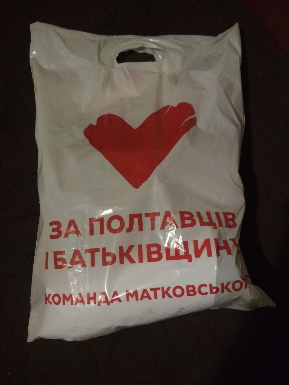 Крім продуктового набору, в пакеті міститься й агітаційна листівка, де лідер Полтавського міського осередку ВО «Батьківщина» Андрій Матковський розповідає, як важко виживати пенсіонерам у часи кризи та як він прагне їм полегшити життя. Для того ще на початку літа депутат запропонував видати кожному полтавському пенсіонеру по 1 тис. грн з міського бюджету.