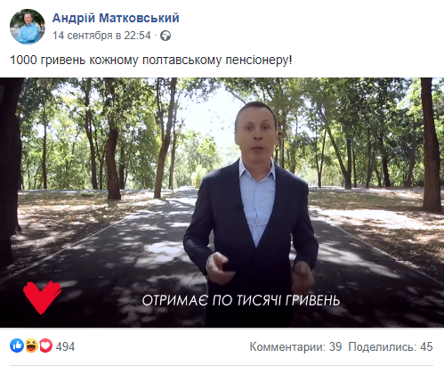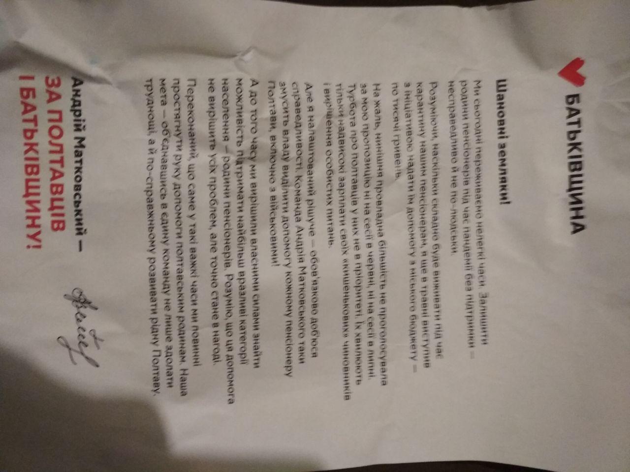 Проте, колеги з інших фракцій ініціативу не підтримали, на що Андрій Матковський поскаржився у публікації у Фейсбуці. У дописі потенційний кандидат переконує громаду, що свою тисячу гривень полтавські пенсіонери отримають у майбутньому. У листівці ж, вкладеній до пакету з продуктами, йдеться про те, що, попри недбалість влади, команда Матковського власними силами допомагає пенсіонерам у скрутні часи.
