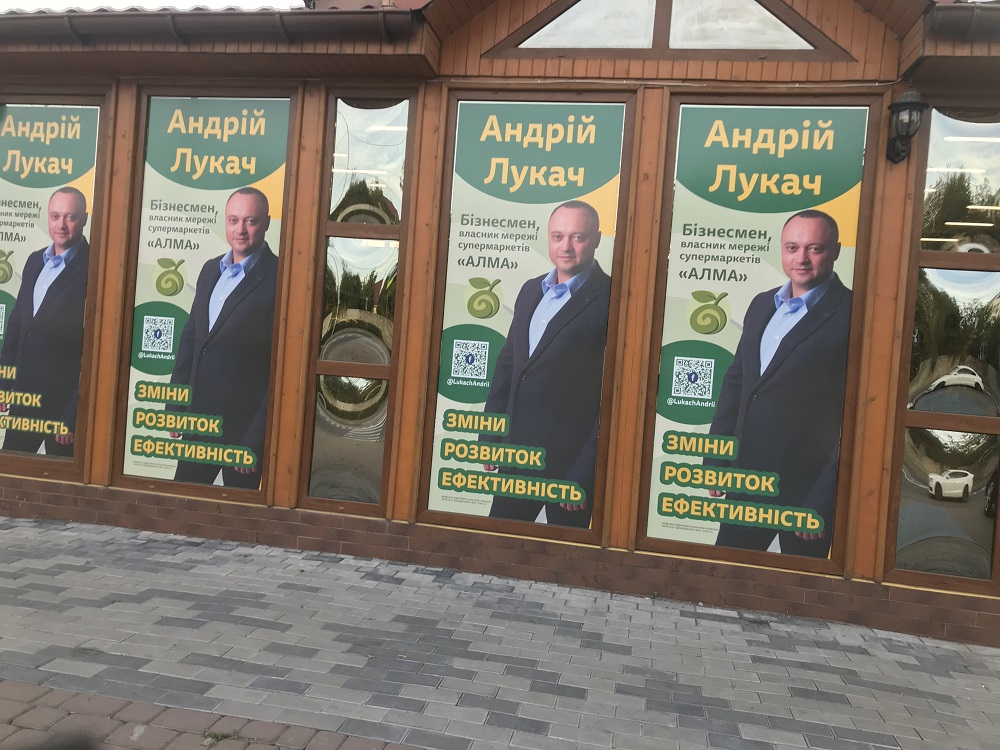 6 вересня у Мукачеві спостерігач ОПОРИ зафіксував на вітринах магазину «Alma», що на вулиці Данила Галицького у Мукачеві, плакати із зображенням потенційного кандидата Андрія Лукача. На плакатах розмістили написи – «Андрій Лукач – бізнесмен, власник мережі супермаркетів «Алма». Зміни, розвиток, ефективність». Згідно з вихідними даними, плакати потенційний кандидат роздрукував на власному обладнанні, тираж – 50 примірників, відповідальний за друк – Лукач А. А..
