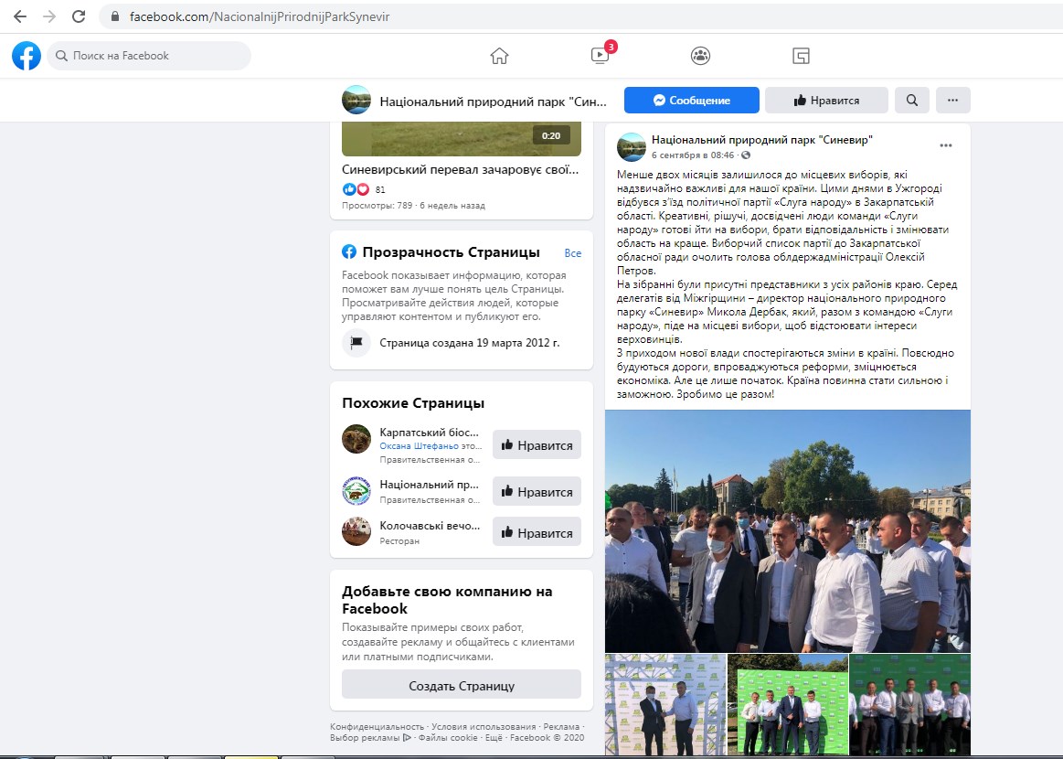 Також 6 вересня на офіційній сторінці Національного природного парку «Синевир» у фейсбуку опублікували допис про з’їзд політичної партії «Слуга народу». У дописі повідомляють, що до місцевих виборів залишилося менше двох місяців та розповідають про з’їзд політичної партії «Слуга народу» в Закарпатській області (як верифікували спостерігачі ОПОРИ, 6 вересня в партії був не з’їзд, а публічний захід щодо представлення команди). У публікації додають, що люди команди «Слуги народу» готові йти на вибори та змінювати область на краще.
