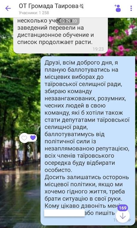 Раніше вона публічно заявляла, що має намір балотуватися у депутати селищної раді, зокрема публікувала інформаційні повідомлення про це у чатах місцевих вайбер-груп.