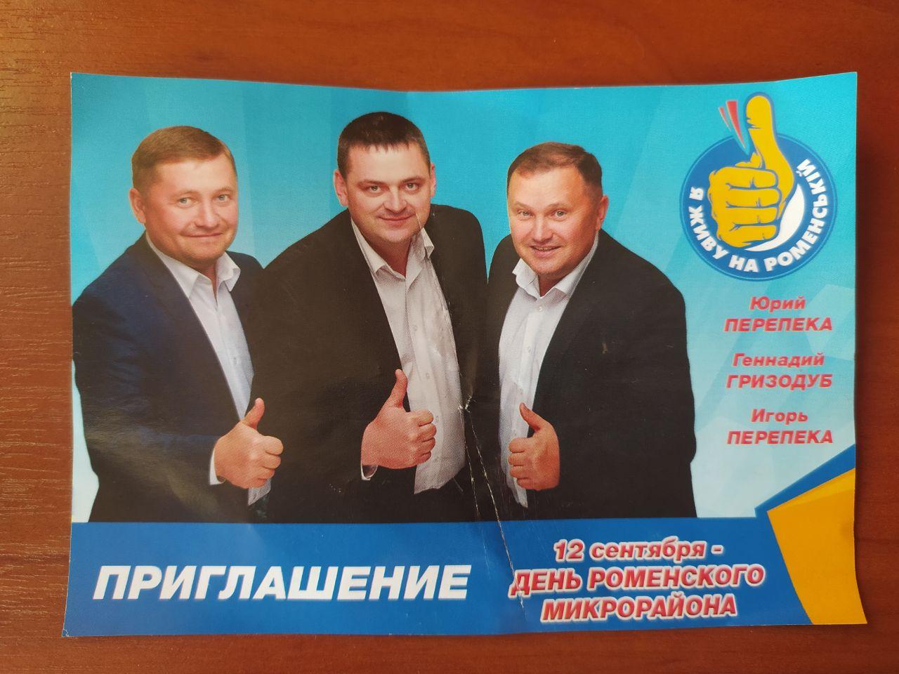 В Сумах 12 вересня спостерігачі ОПОРИ зафіксували проведення святкового заходу «День Роменського мікрорайону» із залученням місцевих артистів на території стадіону ЗОШ №25. Присутнім роздавали кульки з написом: «Я живу на Роменській». На запрошенні зображені депутати Сумської міської ради 7 скликання: Юрія Перепека, Геннадій Гризодуб та Ігор Перепека («Опозиційна платформа - За життя»).