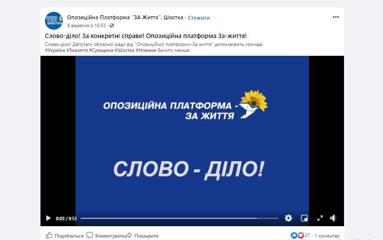 Шосткинська організація «Опозиційна платформа - За життя» опублікувала допис на сторінці «Опозиційна платформа - За життя. Шостка» із відео-звітом роботи депутатів обласної ради - членів партії «Опозиційна платформа - За життя». Зокрема у відео йдеться, що за сприяння депутатів з обласного бюджету виділені кошти на купівлю асенізаторської машини для комунального підприємства Шостки, а також про те, що депутати сприяли ремонту каналізаційного колектору, зокрема за ініціативою депутата Володимира Пилипейка розпочався ремонт дороги Шостка-Зноб-Новгородське: