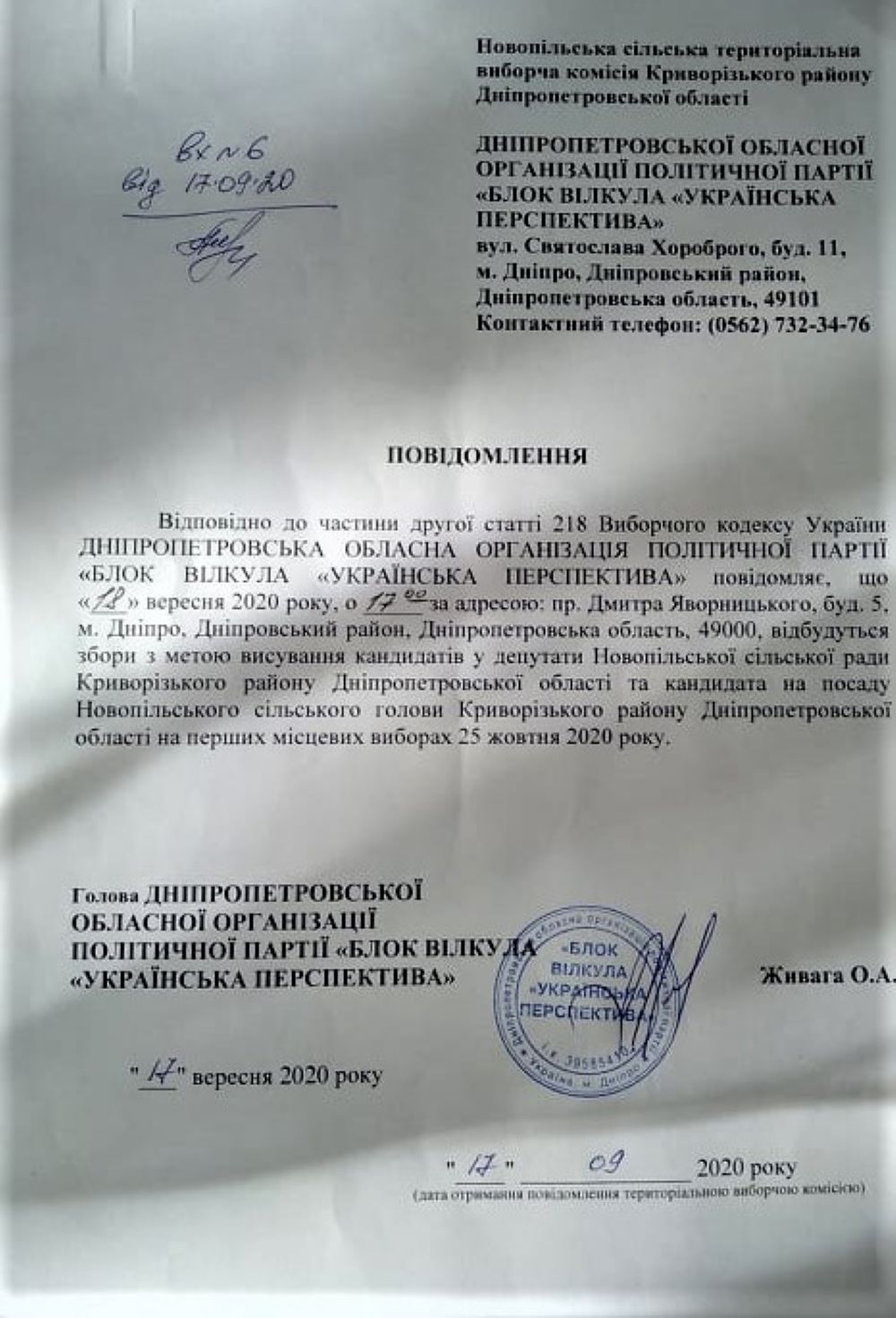 18 вересня у м. Дніпро пройшла конференція обласної організації партії «Блок Вілкула «Українська перспектива». На офіційному сайті партії та офіційній Фейсбук-сторінці спостерігачі ОПОРИ не зафіксували опублікованих умов акредитації. 18 вересня спостерігачі ОПОРИ приїхали до офісу партії за адресою пр. Яворницького, 5, де в той час проходила конференція. Потрапити до офісу не вдалося, на дверях був електронний замок, а на телефонні дзвінки ніхто не відповідав.