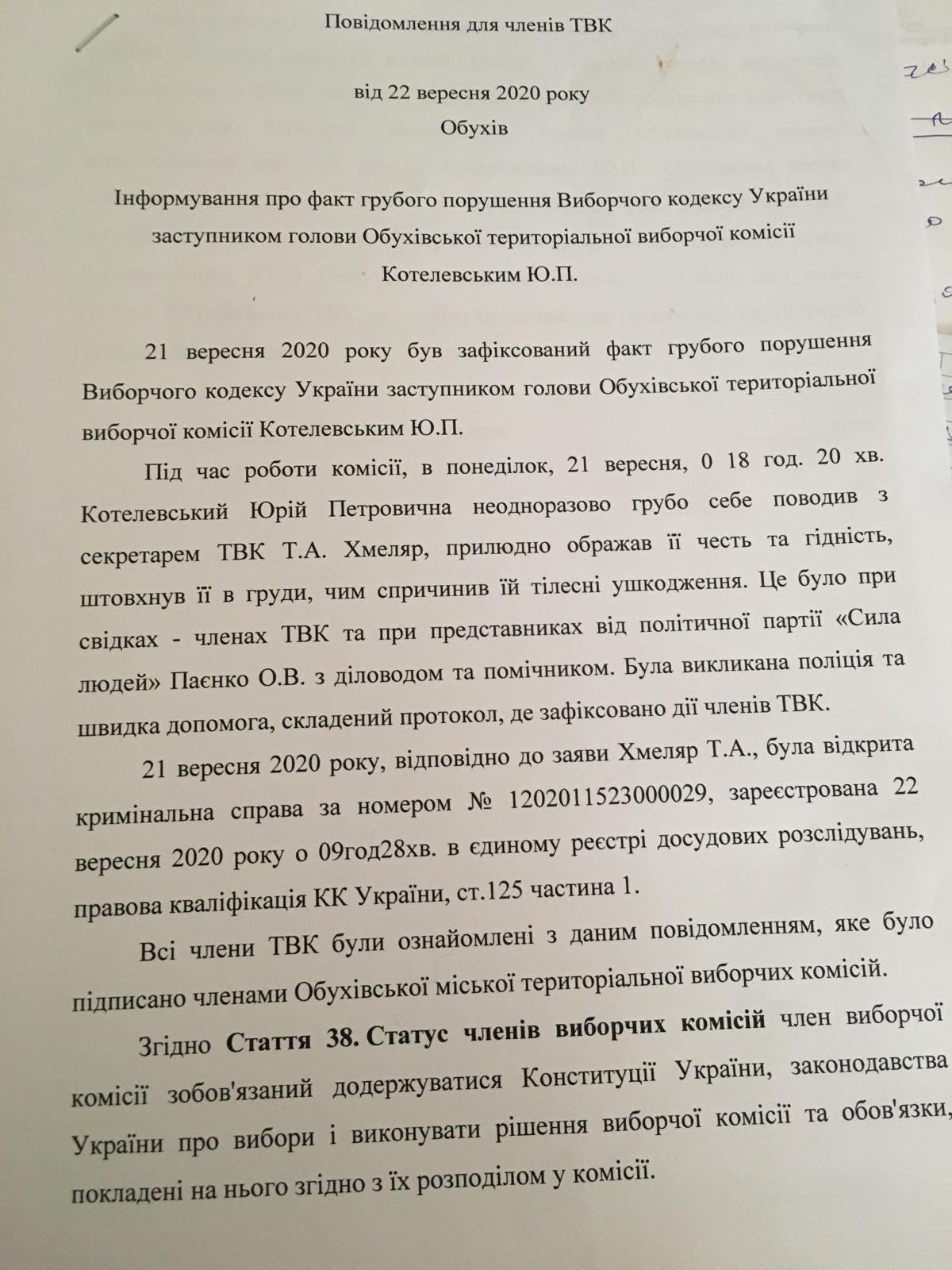 Зі слів Таїсії Хмеляр, заступник Юрій Котелевський декілька разів виходив та повертався до приміщення ТВК, й під час останнього повернення він двома долонями вдарив секретаря в грудну клітину, по тому жінка відступила декілька кроків назад та ледь не впала. Також, наголосила секретар Обухівської міської ТВК, заступник комісії підвищив тон, зайшовши всередину, по тому залишив приміщення та не повертався. Таїсії Хмеляр викликали швидку внаслідок підвищеного артеріального тиску, також на місце події прибула патрульна поліція. За даним фактом було відкрите кримінальне провадження за ч.1 ст. 125 Кримінального кодексу (умисне легке тілесне ушкодження).