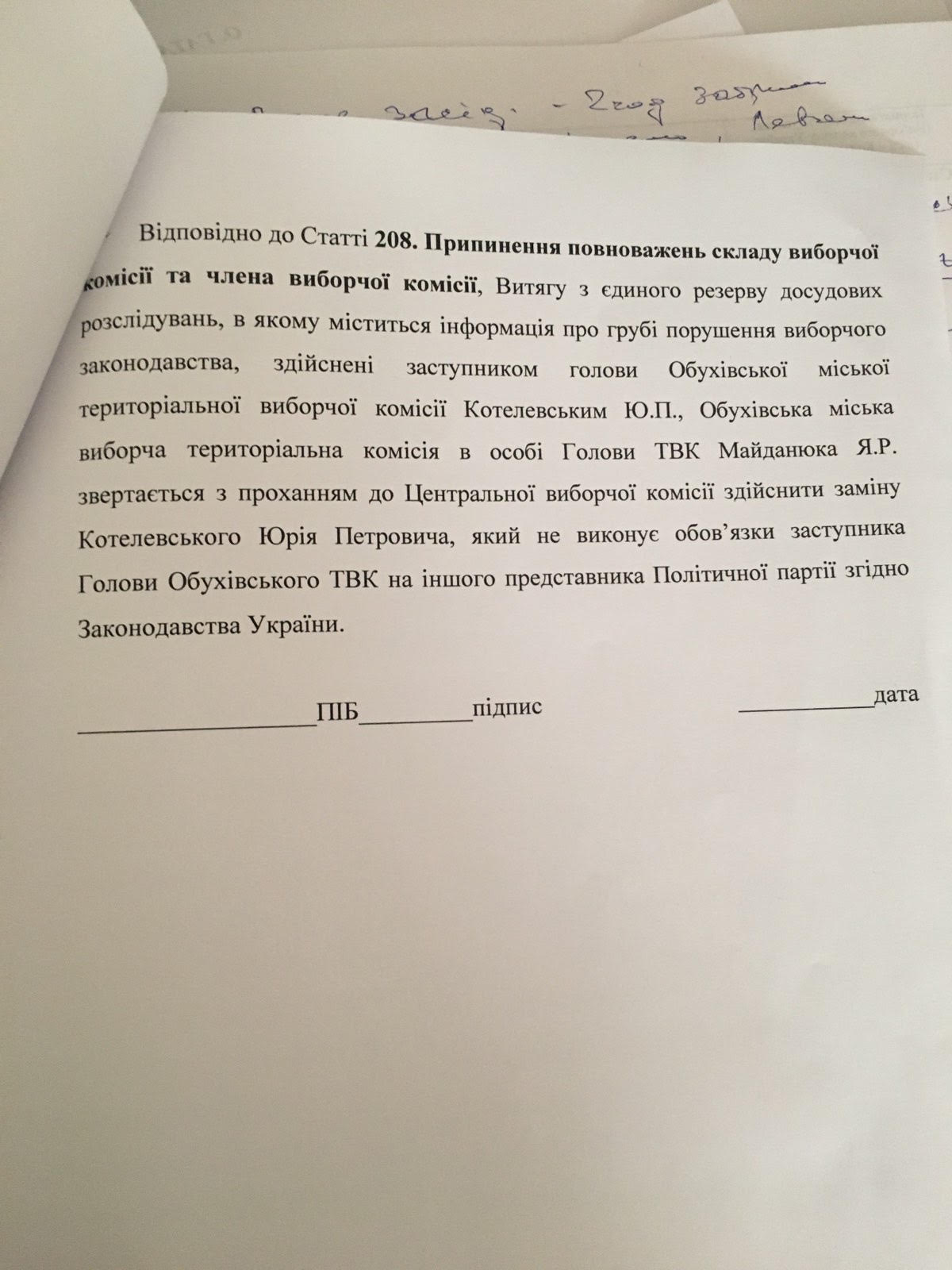 Наступного дня відбулося засідання Обухівської міської ТВК. На порядку денному були два питання: зняття заступника голови ТВК Юрія Котелевського із займаної посади у комісії на платній основі (питання не стосувалося інциденту, було узгоджене заздалегідь) та повідомлення членів ТВК про факт грубого порушення Виборчого кодексу Юрієм Котелевським, що сталося напередодні, з подальшим зверненням до ЦВК.
