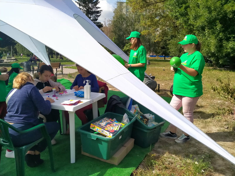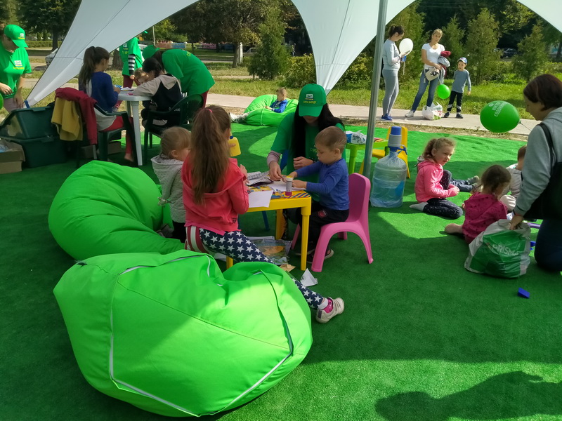 У наметі організована зона відпочинку для дітей, столи та стільчики для ігор і малювання, іграшки, крісла-мішки. Дітям та дорослим роздають білі та зелені кульки з прізвищем кандидата.
