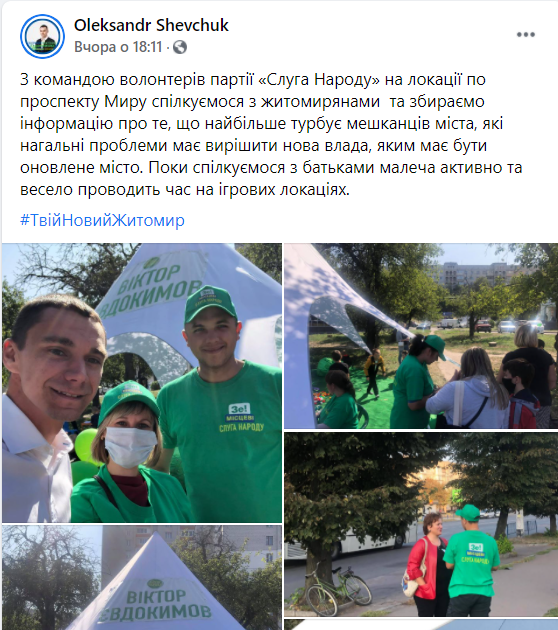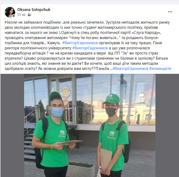 “Ніколи не займалася подібним ..але реально зачепило. Зустріла неподалік житнього ринку двох молодих хлопчиків (один із них точно студент житомирського політеху, приїхав навчатися, за іншого не знаю ).Одягнуті в спец робу політичної партії «Слуга Народу», проводять опитування житомирян "Чому їм погано живеться..." та роздають бонуси- торбинки для товарів... Кажуть #ВикторЄвдокимов організував їх на таку працю...”, – написала Оксана Солопчук.