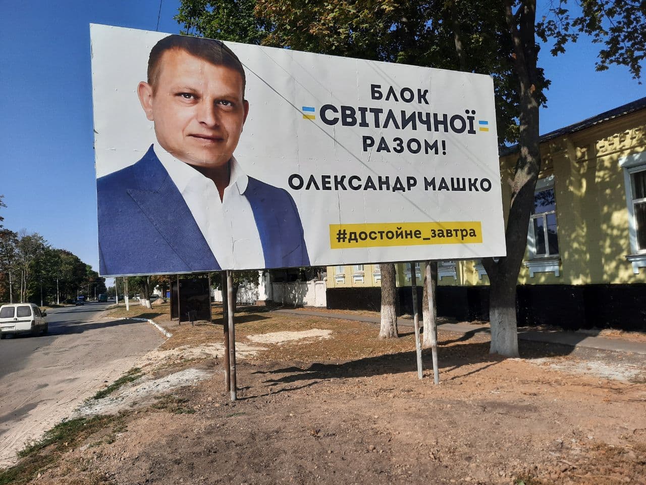 Білборд з його зображенням, іменем партії та слоганом #Достойне_Завтра встановлений на території міста. При цьому борд не має жодних вихідних даних.