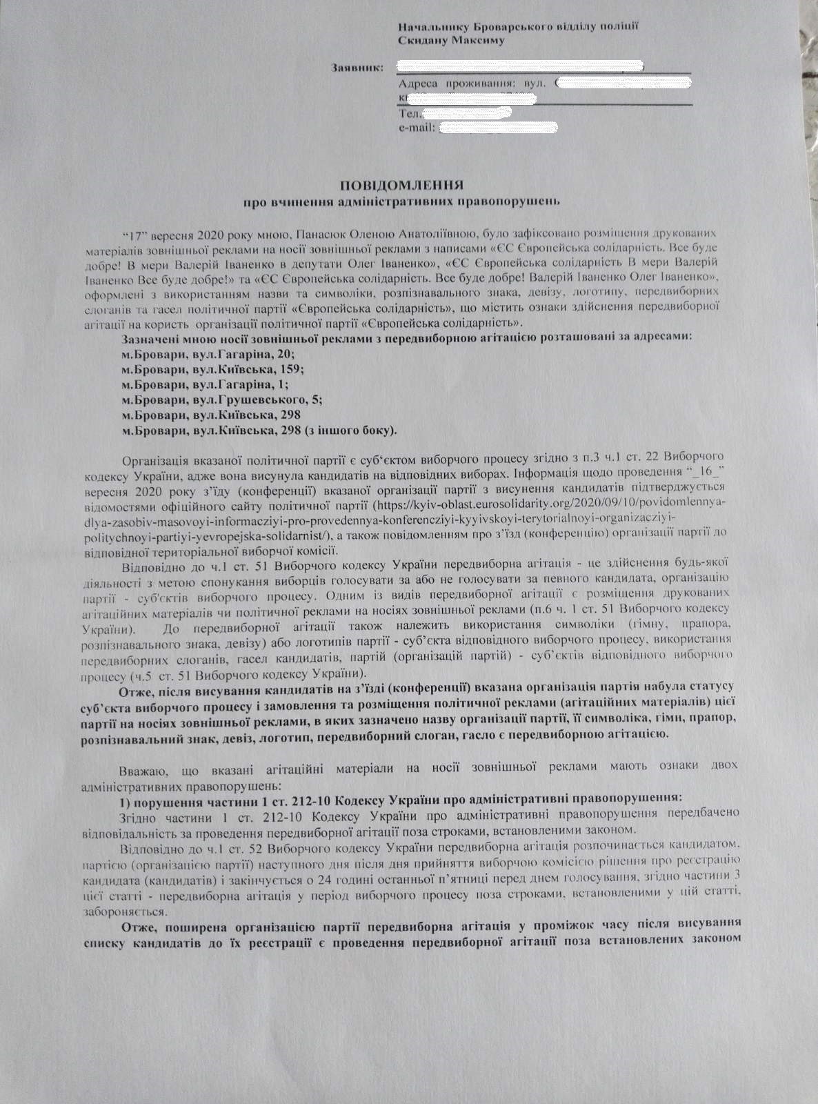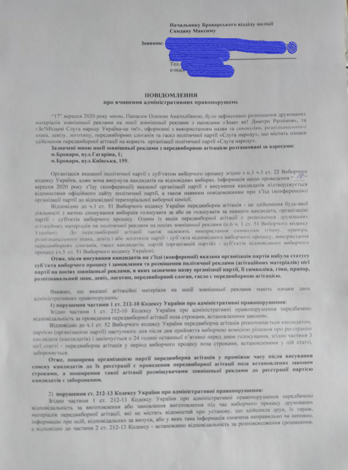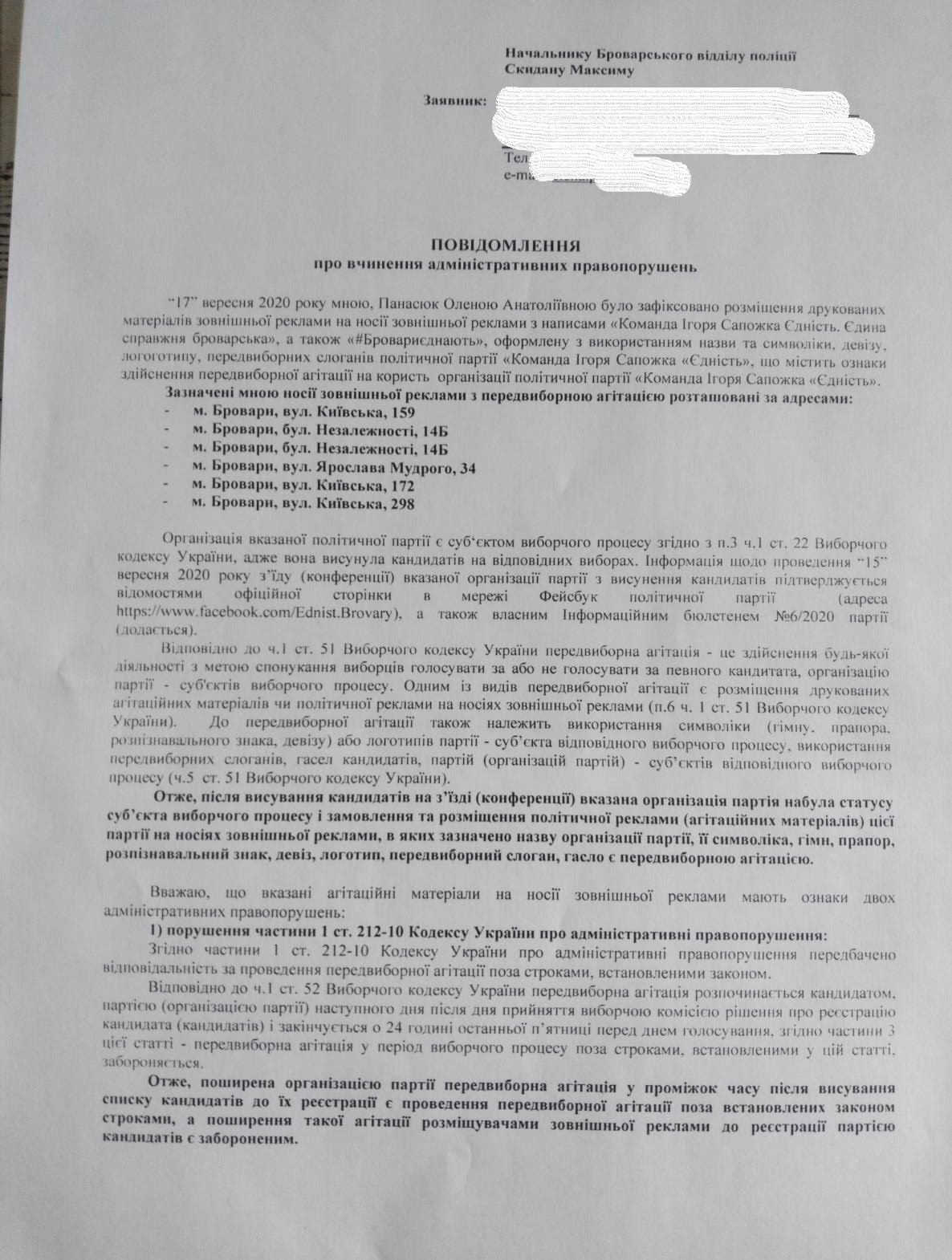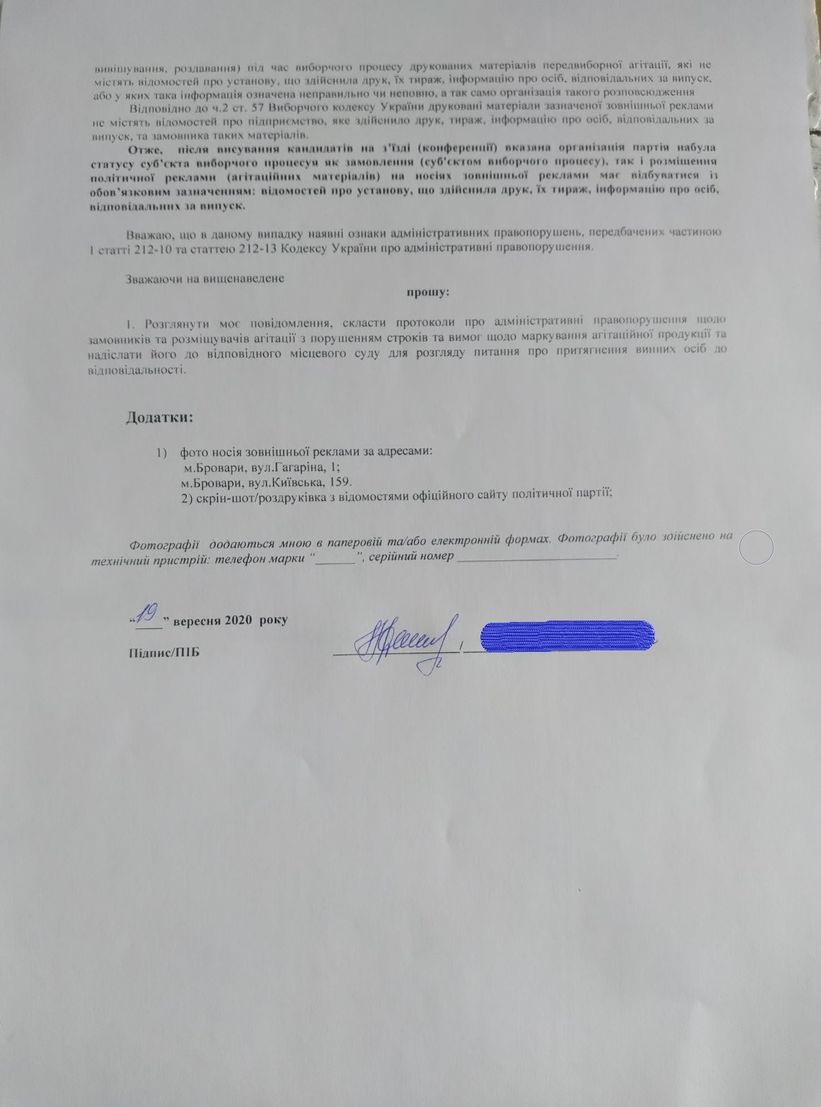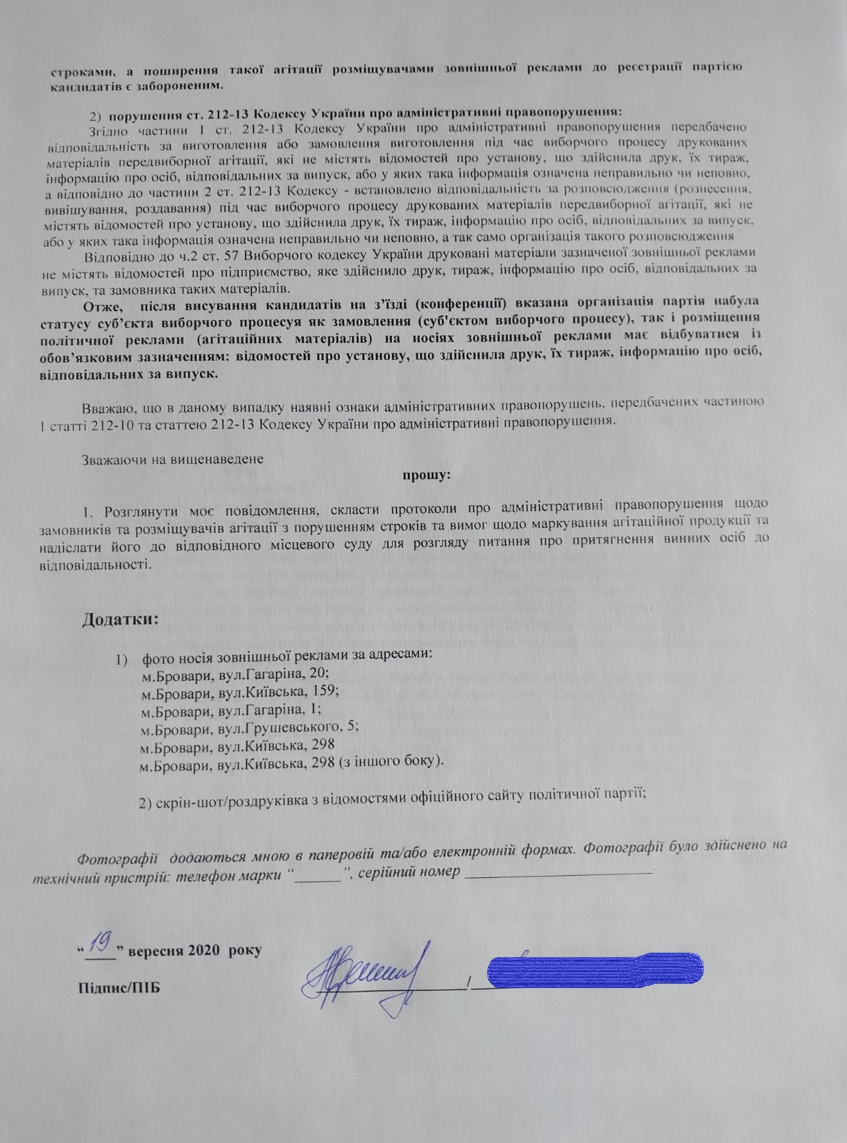 У Броварській ТГ 19 вересня спостерігачі ОПОРИ до поліції подали 3 заяви про можливе адміністративне правопорушення щодо недотримання термінів агітації не з виборчого фонду та агітації без вихідних даних. Заяви стосувалися білбордів від політичних партій «Слуга народу» - 2, «Європейська солідарність» - 6, політсила «Команда Ігоря Сапожка «Єдність» - 6 білбордів.