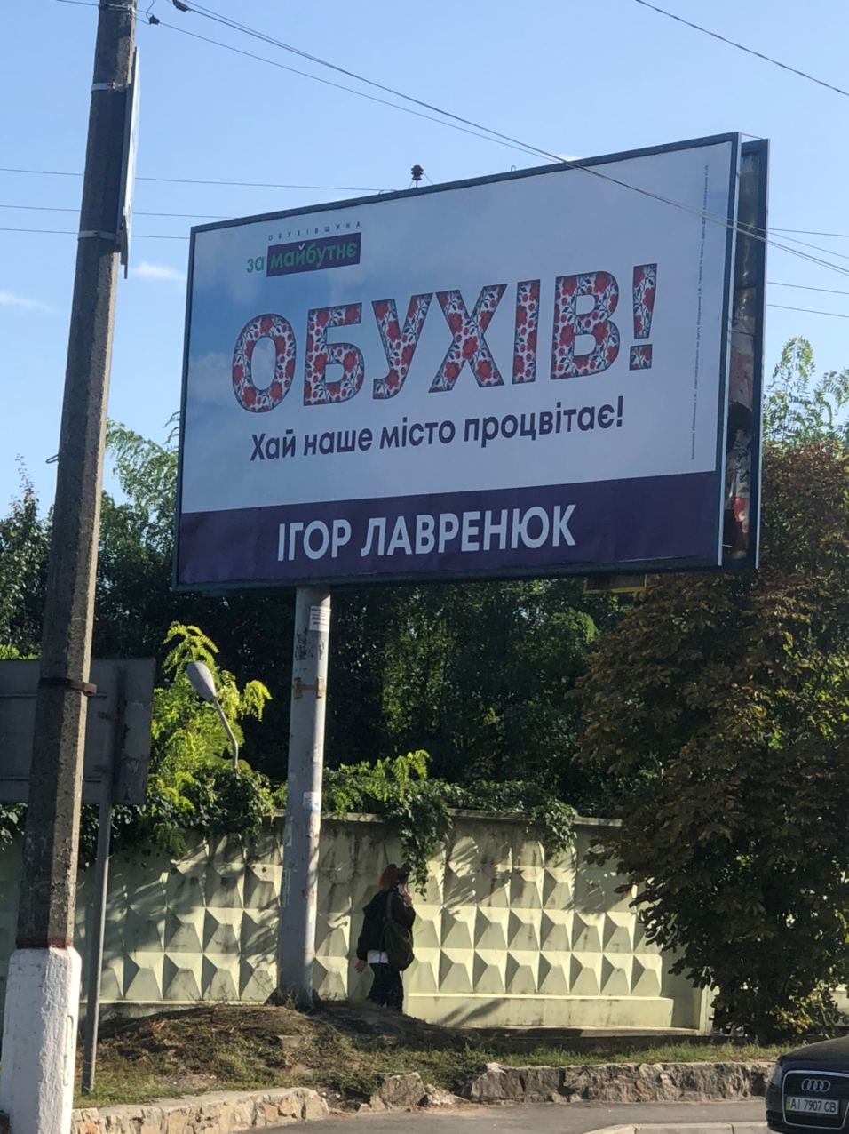 Того ж дня, 19 вересня, вже в Обухові, що на Київщині, спостерігачі ОПОРИ зафіксували 2 білборди політичної партії «Слуга народу» та політсили «За майбутнє» з порушеннями умов ведення агітації, які стосуються ч.1 ст. 212-10 КУпАП (ведення передвиборчої агітації поза строками встановленими законом) та ч. 1 ст. 212 -13 КУпАП (виготовлення або замовлення виготовлення друкованих матеріалів передвиборчої агітації, які не містять відомості про установу, що здійснила друк). Вищезгадані політичні партії вже набули статусу суб'єктів виборчого процесу.