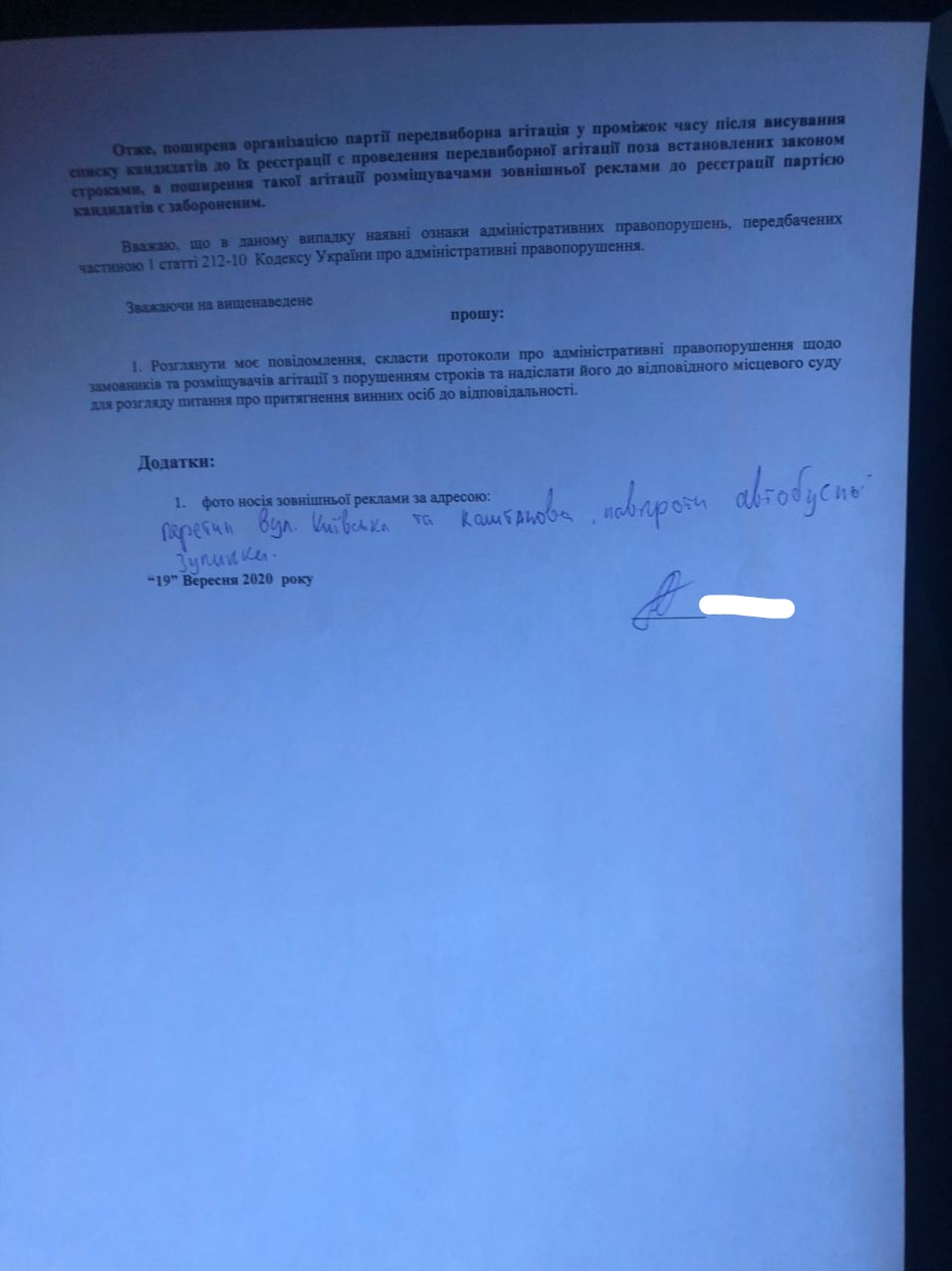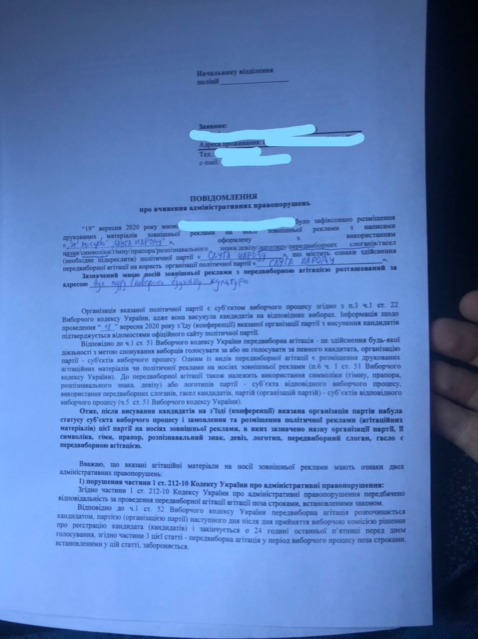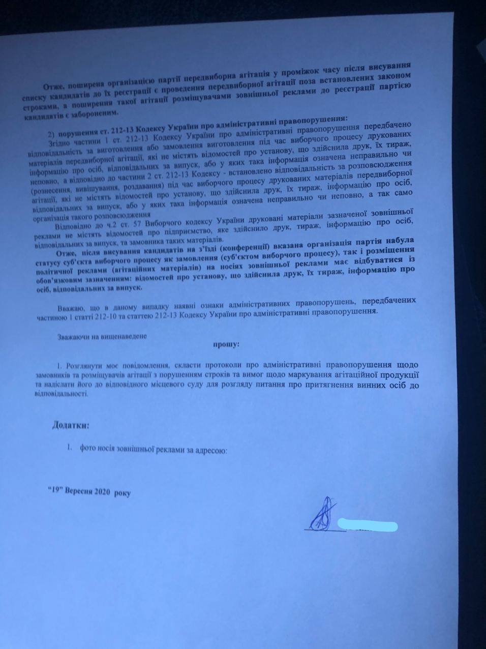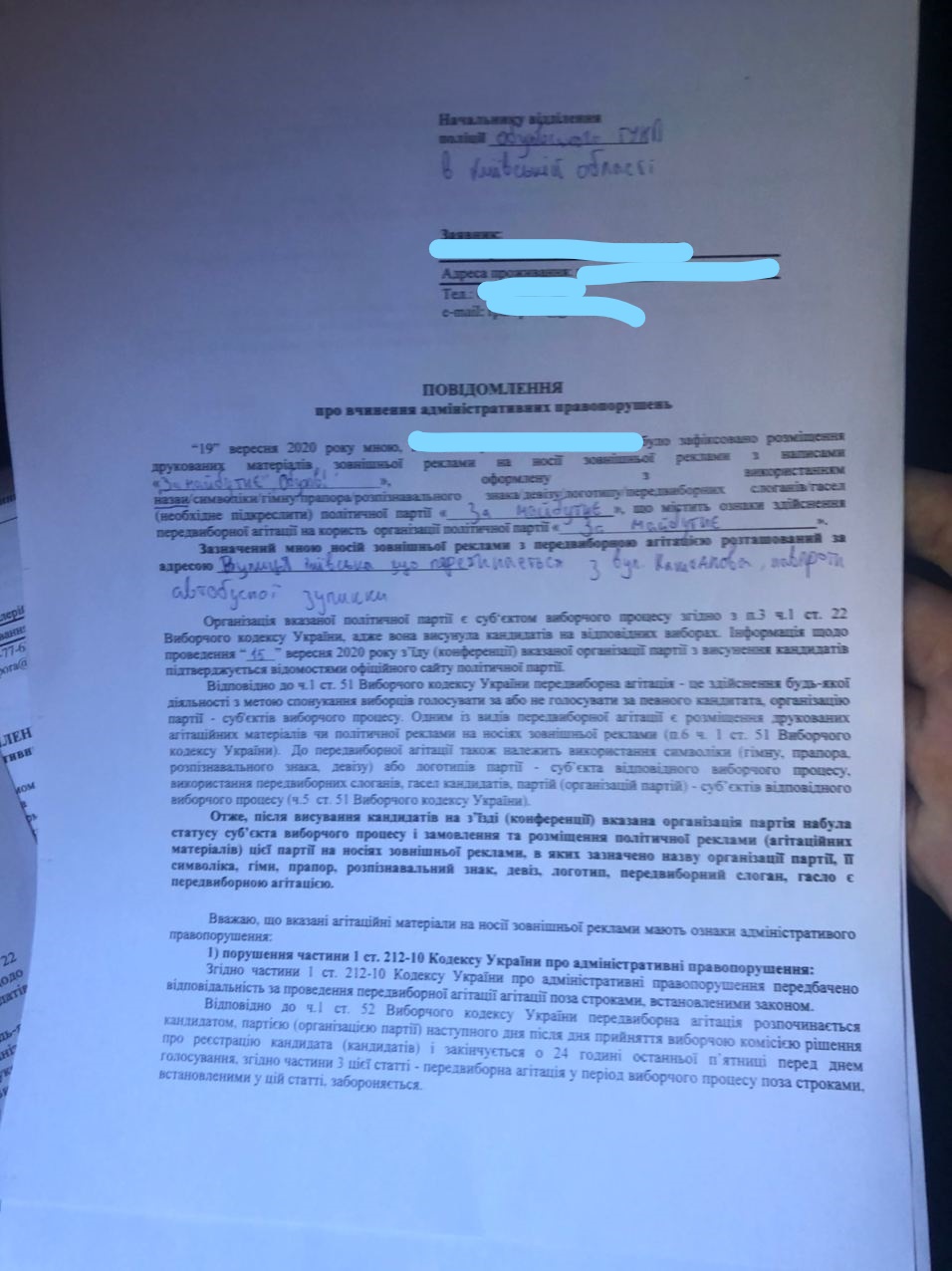 Спостерігач ОПОРИ подав до Обухівського відділу поліції повідомлення про вчинення адміністративного правопорушення щодо кожної вищезгаданої політичної партії та їхньої зовнішньої реклами.