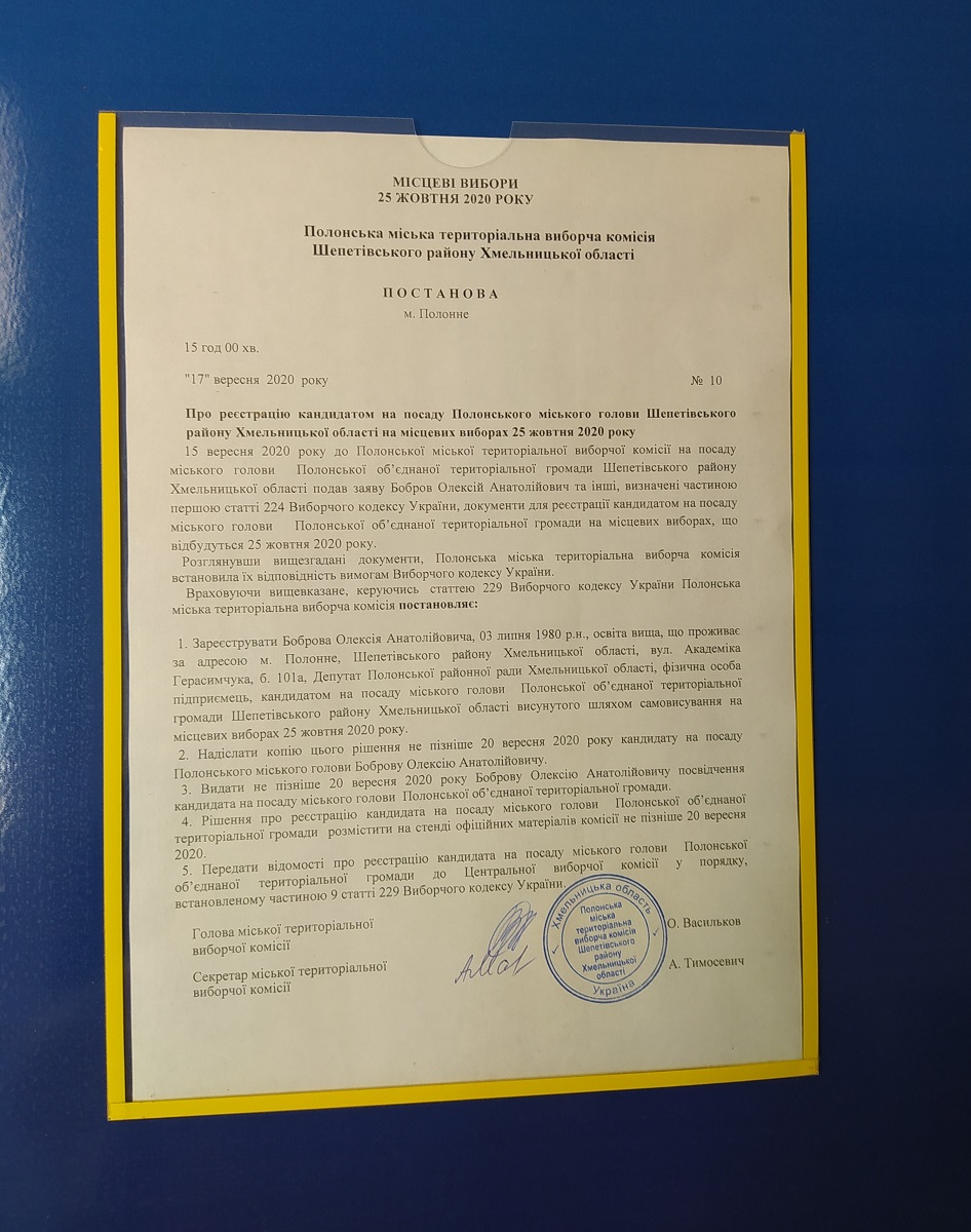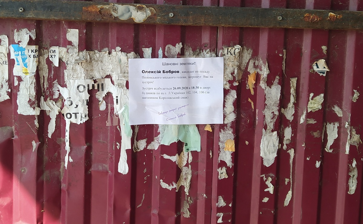 Норма Виборчого кодексу України забороняє розміщення передвиборчої агітації та політичної реклами на будівлях автостанцій і зупинках громадського транспорту. Проте не всі кандидати кандидати зважають на заборону. Так, агітаційні листівки кандидата на посаду Полонського міського голови спостерігач ОПОРИ виявив на автостанції та зупинках громадського транспорту в місті Полонному 25 вересня. Зазначимо, що постанова Полонської міської ТВК про реєстрацію Олексія Боброва кандидатом датована 17 вересня 2020 року.
