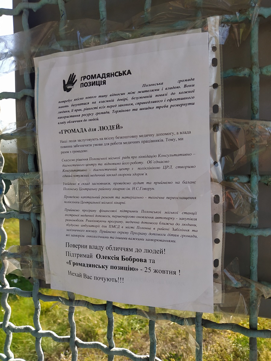 Під час форуму, в якому взяли участь лідери партії в Хмельницькій області, презентували команду до місцевої влади. Про це партійці повідомляли на своїй сторінці у Facebook. І, ймовірно, теперішній селищний голова – один із членів цієї команди. На це вказує ще один банер, який спостерігач ОПОРИ зафіксував у селищі.
