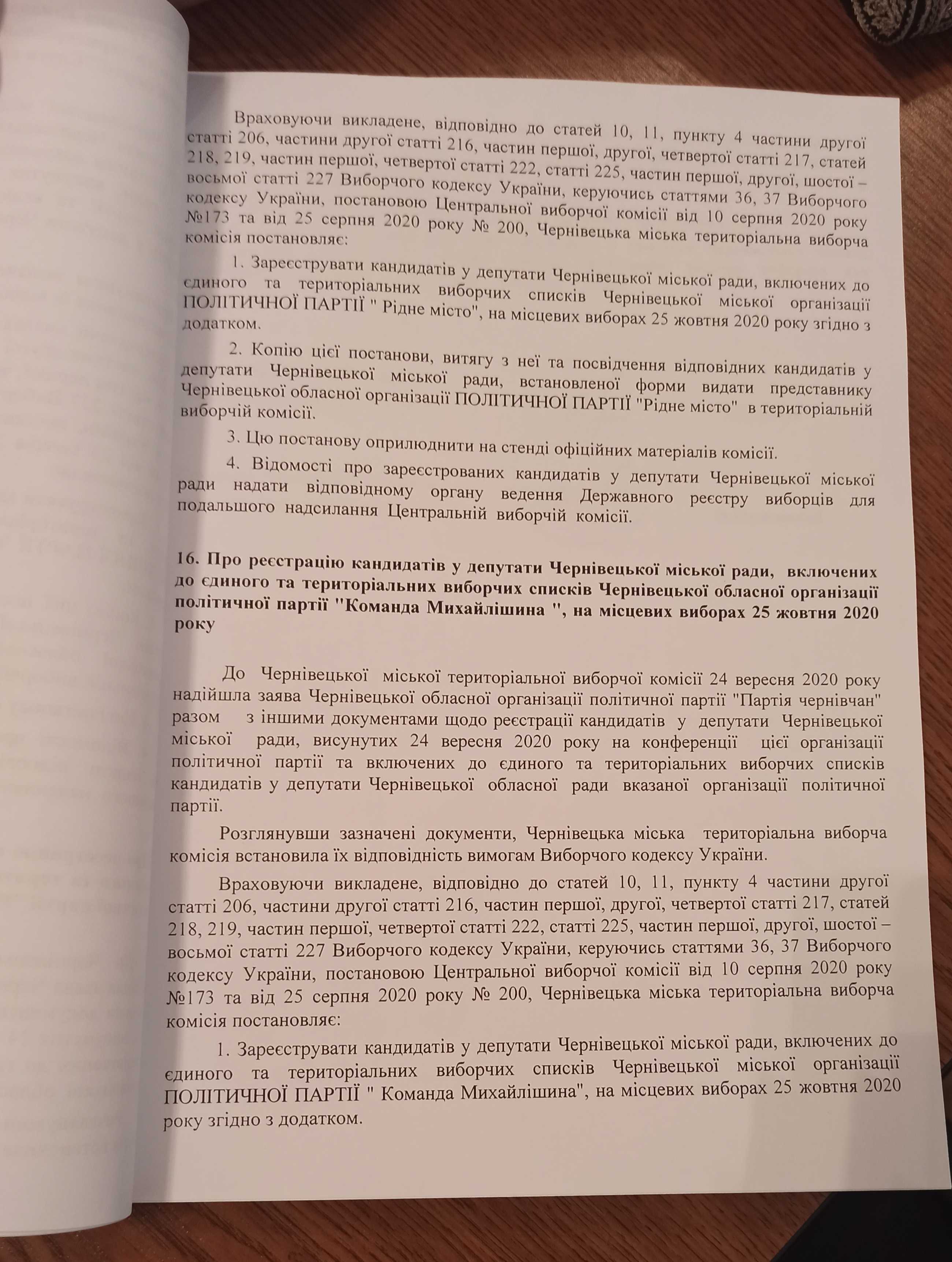 Депутат Чернівецької міської ради від партії «Рідне місто» Ростислав Білик, який є підсудним у справі про підкуп виборців на місцевих виборах 2015 року, представлений у списку політичної партії «Команда Михайлішина». Суд над депутатом Ростиславом Біликом триває досі, а ключові свідки невідомо де.
