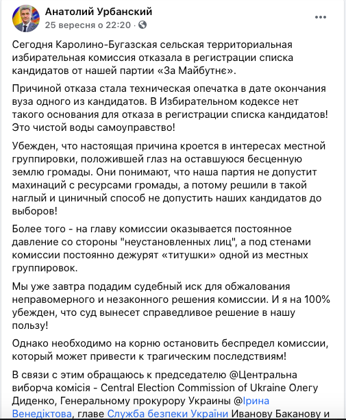 Пізніше голова Одеської обласної організації партії «За майбутнє», народний депутат Анатолій Урбанський на своїй сторінці у Facebook повідомив, що це рішення ТВК буде оскаржено у судовому порядку. Справа розглядається в Одеському окружному адміністративному суді 28 вересня.