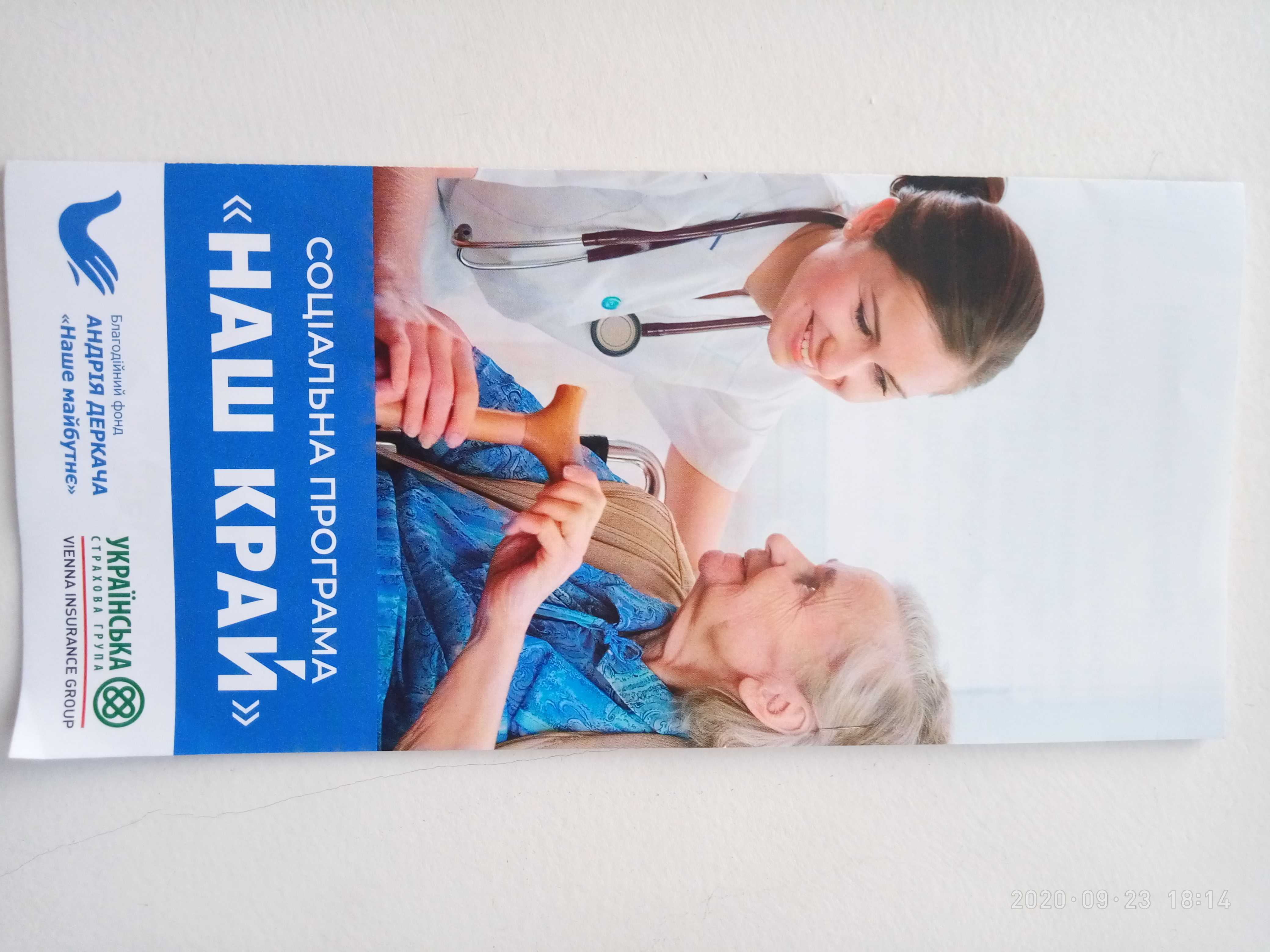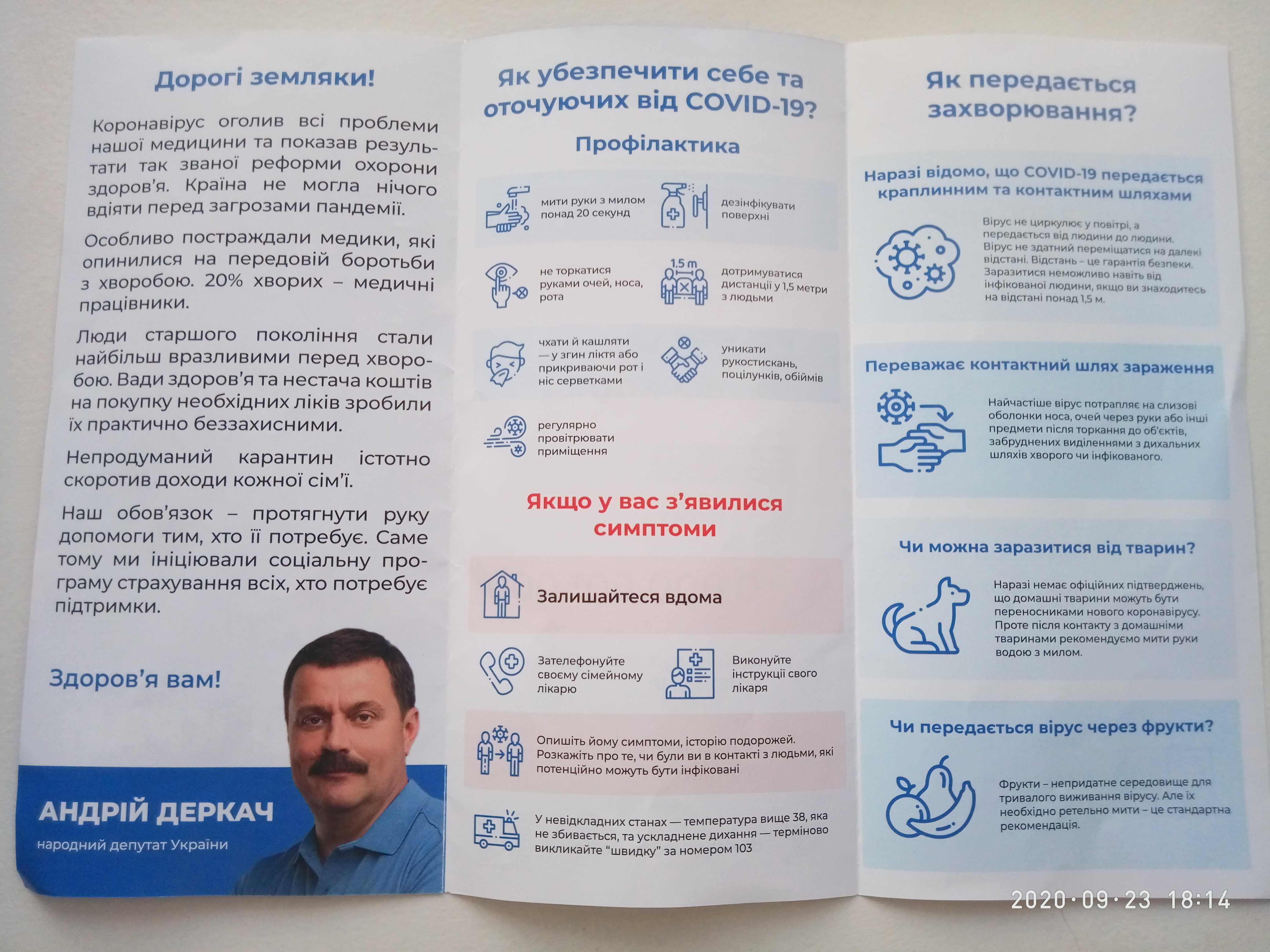 «Дорогі земляки! Коронавірус оголив всі проблеми нашої медицини та показав результати так званої реформи охорони країна нічого не змогла вдіяти проти пандемії. Наш обов’язок протягнути руку допомоги тим, хто її потребує. Саме тому ми ініціювали соціальну програму страхування всіх, хто потребує підтримки», - написано в буклеті із підписом: «Андрій Деркач, народний депутат України».