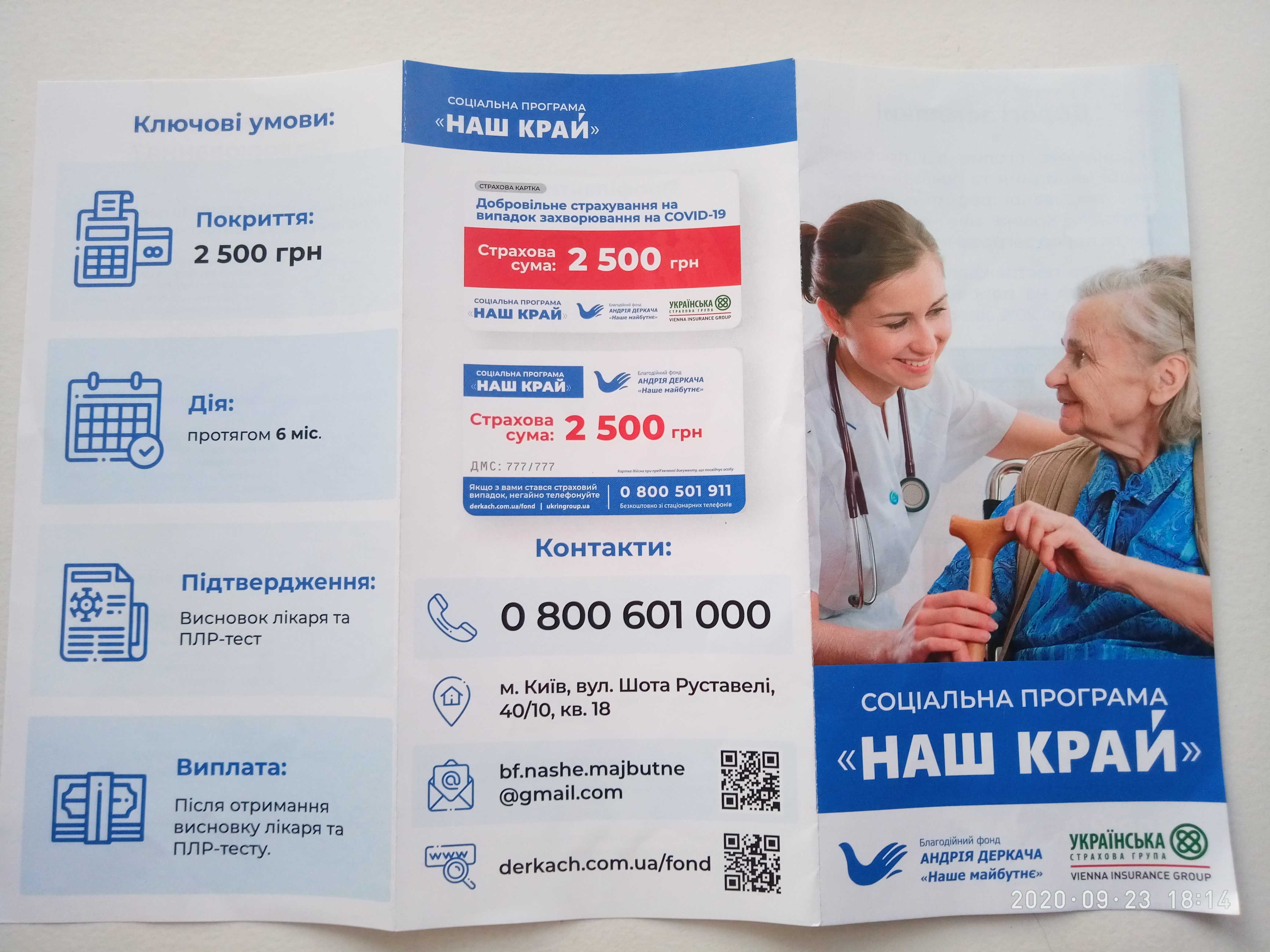 На буклеті зазначено, що соціальна програма передбачає страхування від СОVID-19 на суму 2 500 грн протягом 6 місяців. Як зазначено в буклеті виплата здійснюється після підтвердження висновку лікаря чи ПЛР-тесту.