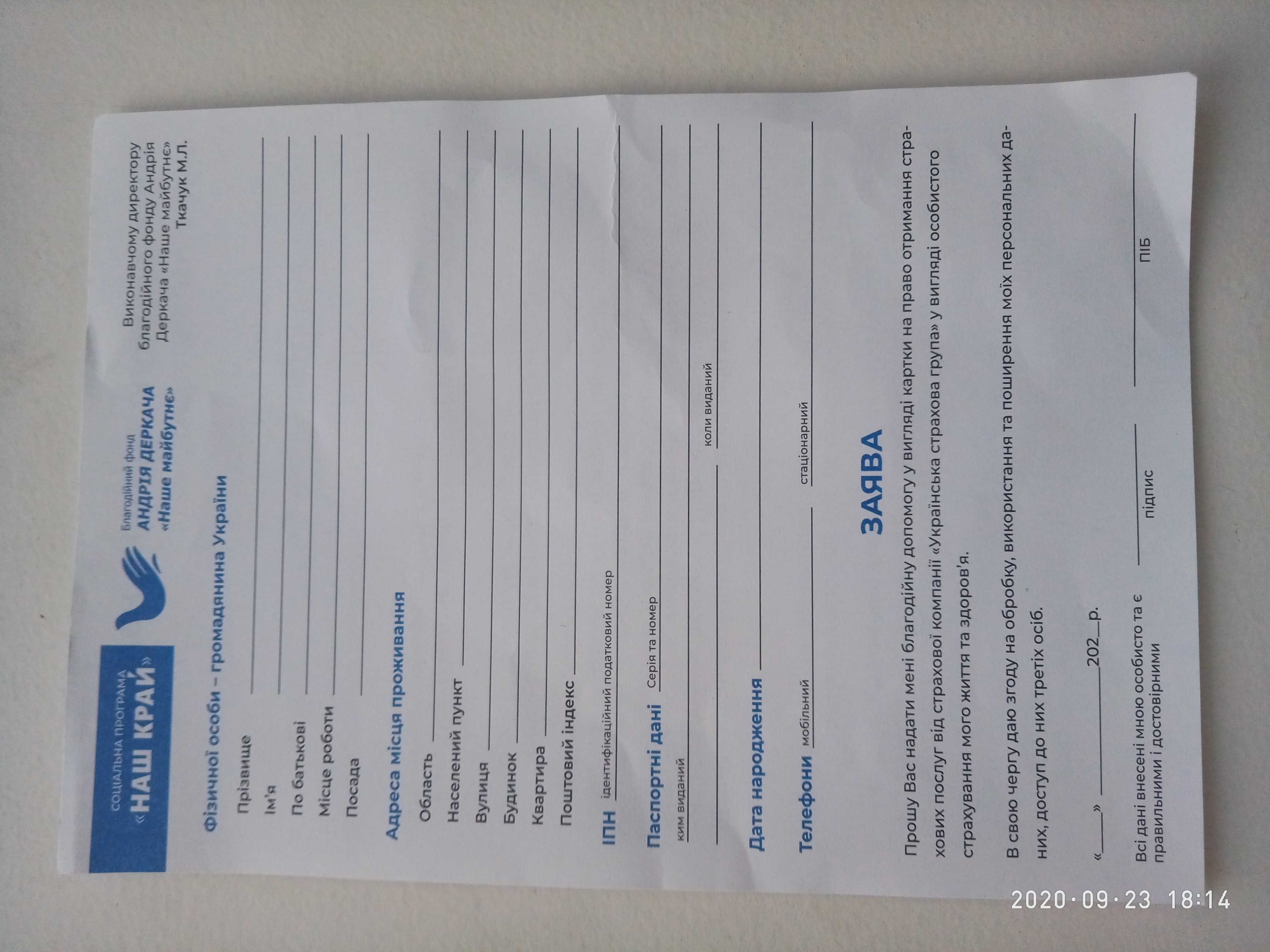 В заяві на ім’я «виконавчого директора благодійного фонду Андрія Деркача «Наше майбутнє» М.Л. Ткачука». Просять зазначити: ім’я, прізвище, по-батькові, місце роботи, посаду, адресу проживання, паспортні дані, номер ідентифікаційного коду, дату народження та номер телефону. Є відповідний пункт про згоду надання персональних даних.