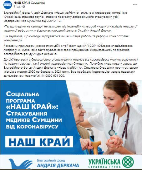 На офіційній сторінці «Наш край» у Facebook, опублікували допис про те, що Благодійний фонд Андрія Деркача «Наше майбутнє» спільно зі страховою компанією «Українська страхова група» створив програму добровільного страхування усіх медпрацівників Сумщини від COVID-19. Крім того, повідомляють, що одна з лікарень вже застрахувала всіх свої працівників: