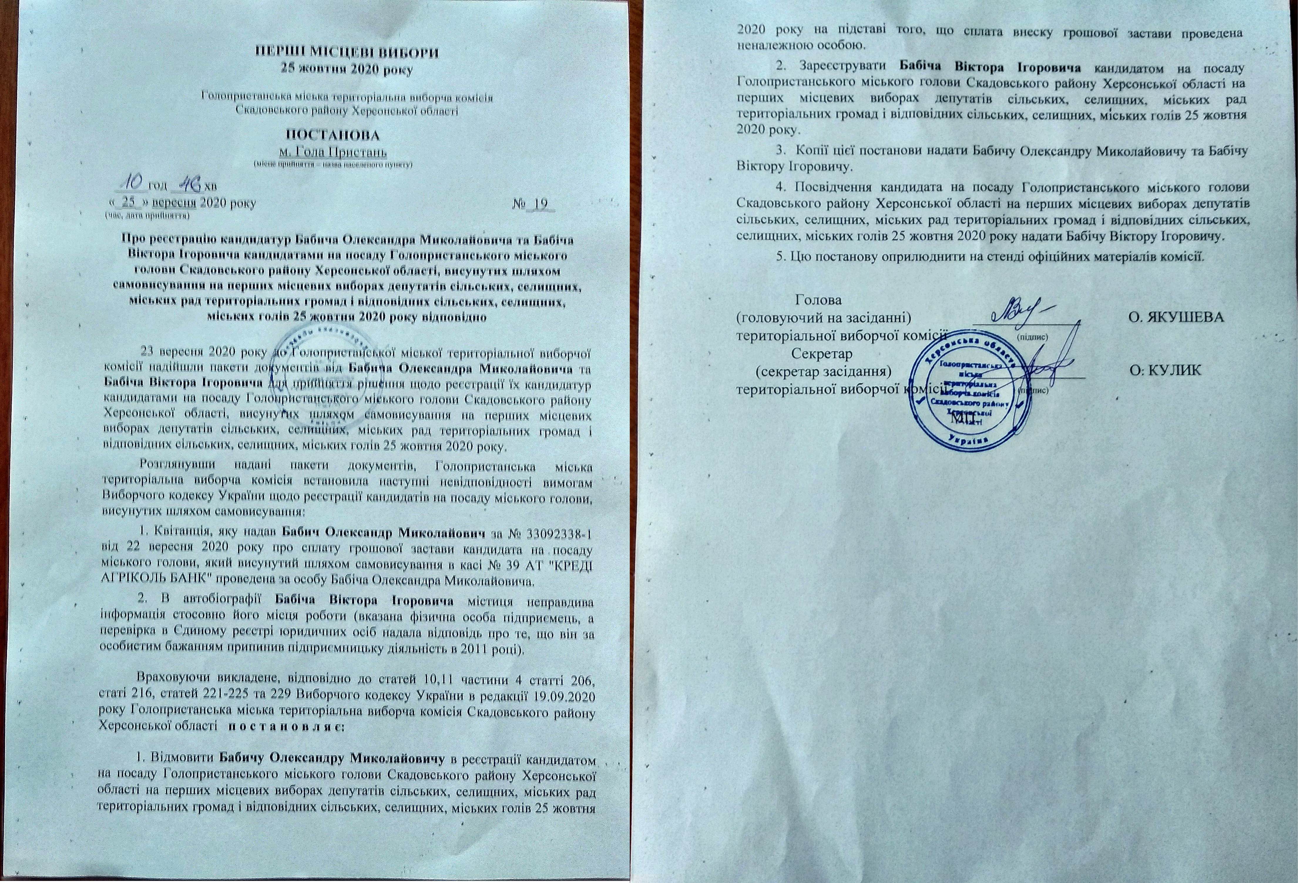 На засіданні Голопристанської міської ТВК 25 вересня комісія встановила, що платіжна квитанція проведена не відповідною особою: прізвище кандидата Бабич, а платіжка надана від Бабіча. На підставі цього Бабичу Олександру Миколайовичу було відмовлено в реєстрації кандидатом на посаду міського голови Голої Пристані.