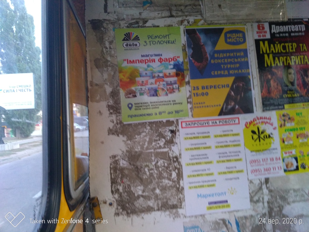 В маршрутних таксі № 5 та 8 обласного центру розмістили оголошення про проведення боксерського турніру серед юнаків. На афіші зображенні елементи з боксерського бою. На синьому фоні написано: «Рідне місто. Відкритий боксерський турнір серед юнаків. 25 вересня о 15:00. Сквер Покровський». Представники ОПОРИ зафіксували цей факт порушення виборчого законодавства та звернулися із заявою до правоохоронних органів.