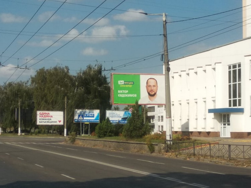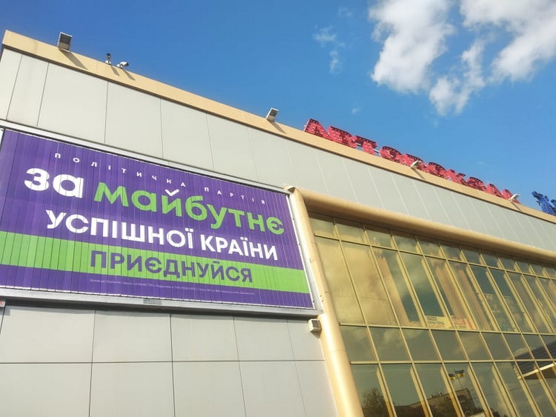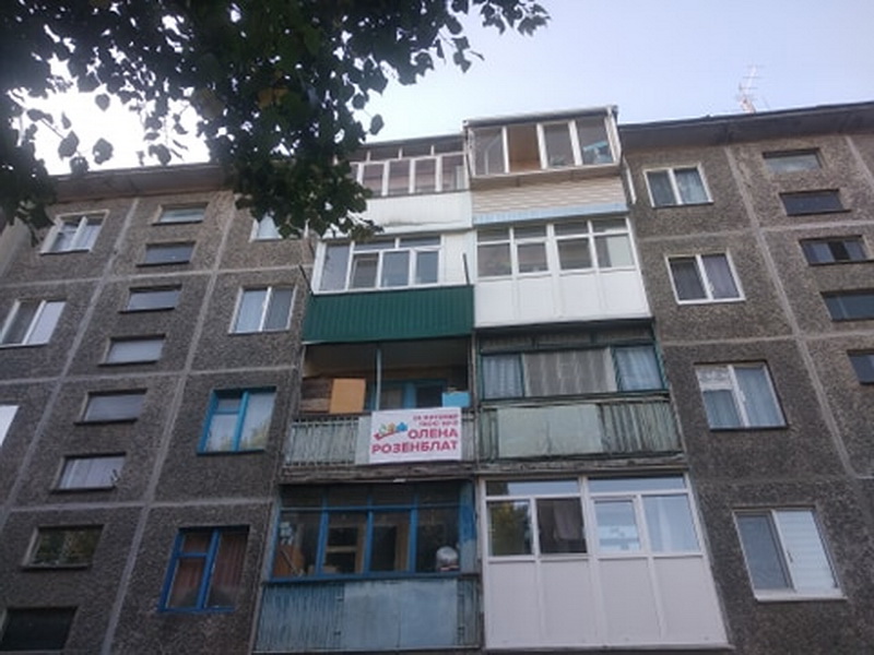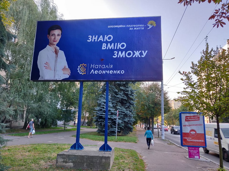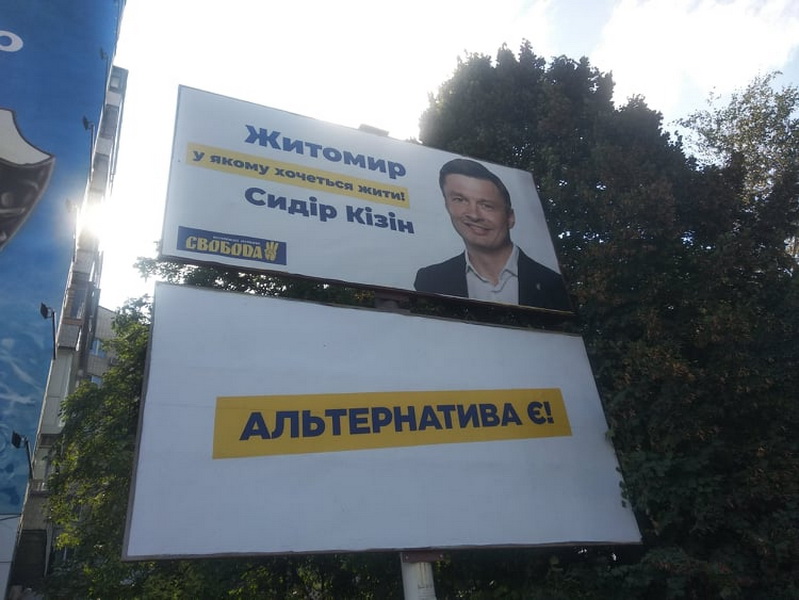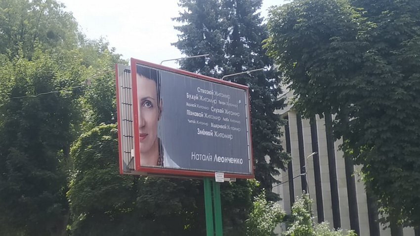 Наприклад, на будівлі готелю “Житомир” 14 вересня вивісили портрет Олени Розенблат (ВО “Батьківщина”) довжиною у 7 поверхів. З іншого боку назва громадської організації, яку очолює Олена. Станом на 25 вересня вона вже є офіційно зареєстрованою кандидаткою на посаду житомирського міського голови. Приміщення готелю зараз належить фірмі «Фаворит Компані», де Олена Розенблат є директоркою та співвласницею.
