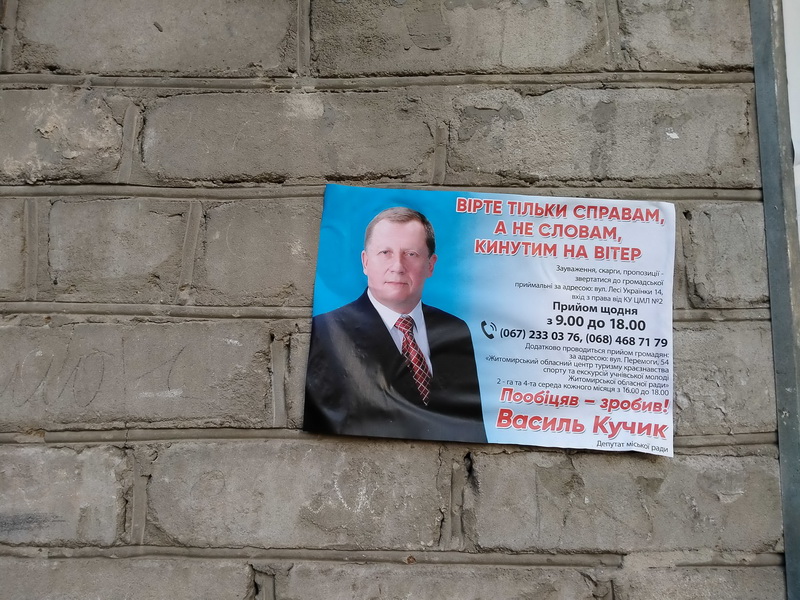 “Поліцейські Житомирського районного відділення ГУНП провели перевірку та склали адміністративний протокол відносно власника бігборду за ознаками правопорушення, передбаченого ч. 2 ст. 212-13 (Виготовлення або розповсюдження друкованих матеріалів передвиборної агітації, які не містять відомостей про установу, що здійснила друк, їх тираж, інформацію про осіб, відповідальних за випуск) КУпАП. Цього ж дня до поліції надійшло повідомлення від голови Овруцької міської виборчої комісії про можливе порушення виборчого законодавства бажаючим зареєструватись у кандидати на посаду міського голови. Перевірка за вказаним фактом триває”, – йдеться у повідомленні поліції.