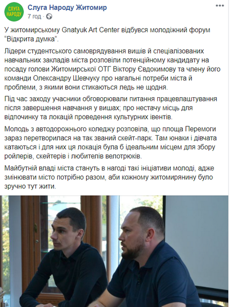 “Лідери студентського самоврядування вишів й спеціалізованих навчальних закладів міста розповіли потенційному кандидату на посаду голови Житомирської ОТГ Віктору Євдокимову та члену його команди Олександру Шевчуку про нагальні потреби міста й проблеми, з якими вони стикаються ледь не щодня...”, – йдеться у дописі на сторінці партії “Слуга Народу Житомир”.