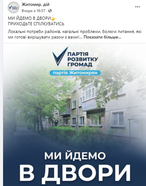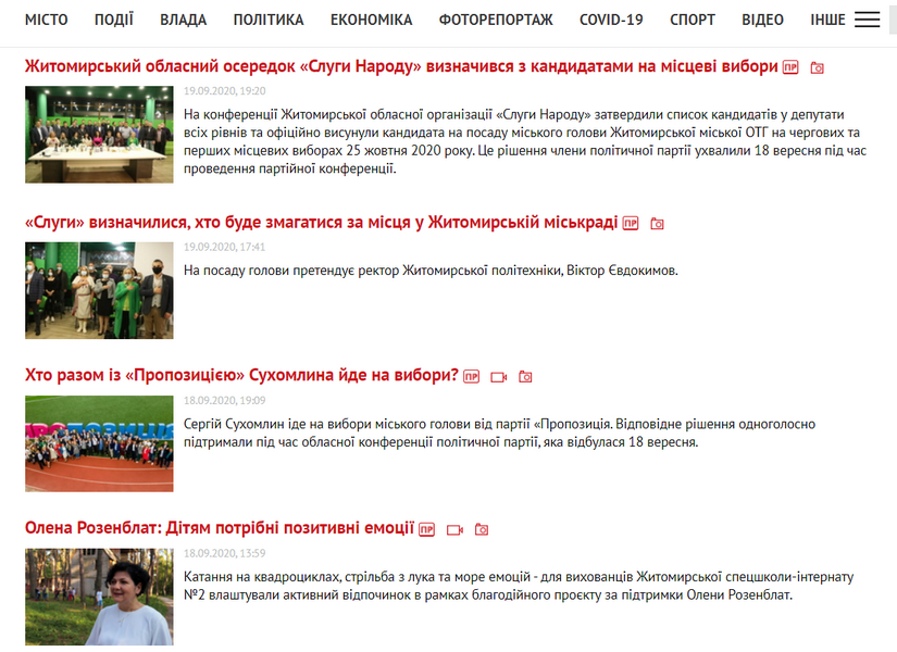 На місцевому сайті “Житомир.info” у розділі “Політика” щодня публікують матеріали про діяльність потенційних кандидатів з відповідним маркуванням.