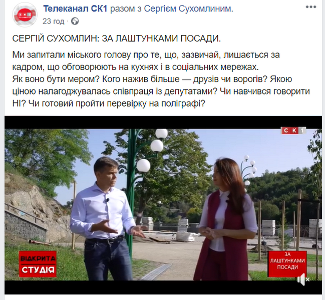 На сторінці телеканалу “СК1” у соцмережі опублікували запис програми “Відкрита студія” з міським головою та кандидатом на цю посаду Сергієм Сухомлином, однак, без маркування.