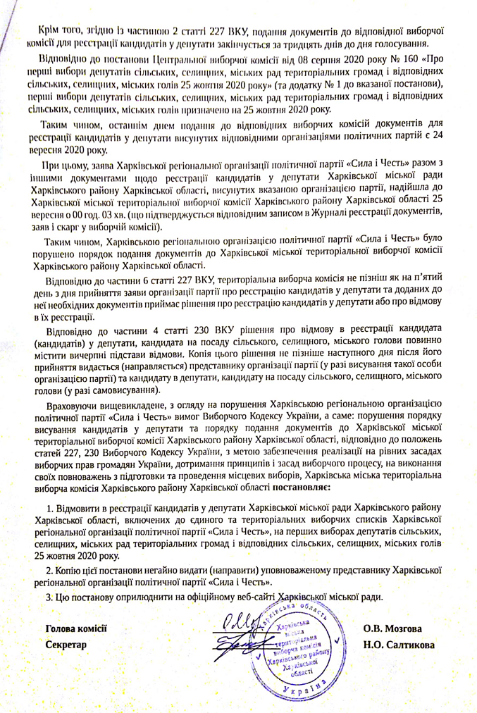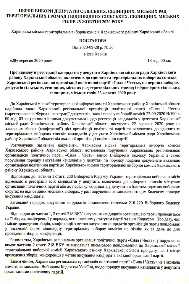 Крім того, Харківська регіональна організація партії «Сила і честь» не повідомила міську ТВК про проведення конференції з висування кандидатів, що є необхідною умовою для участі в виборах.