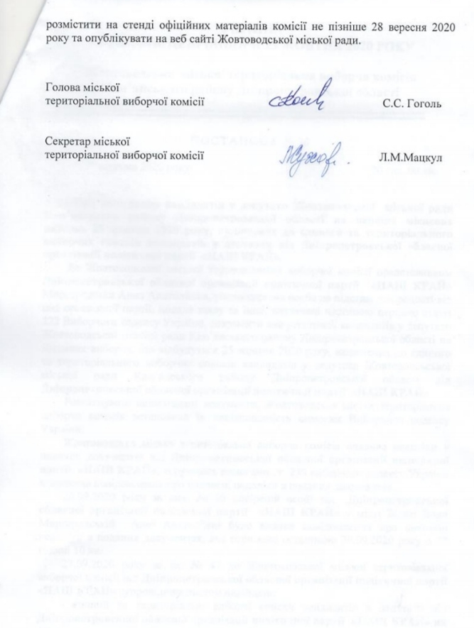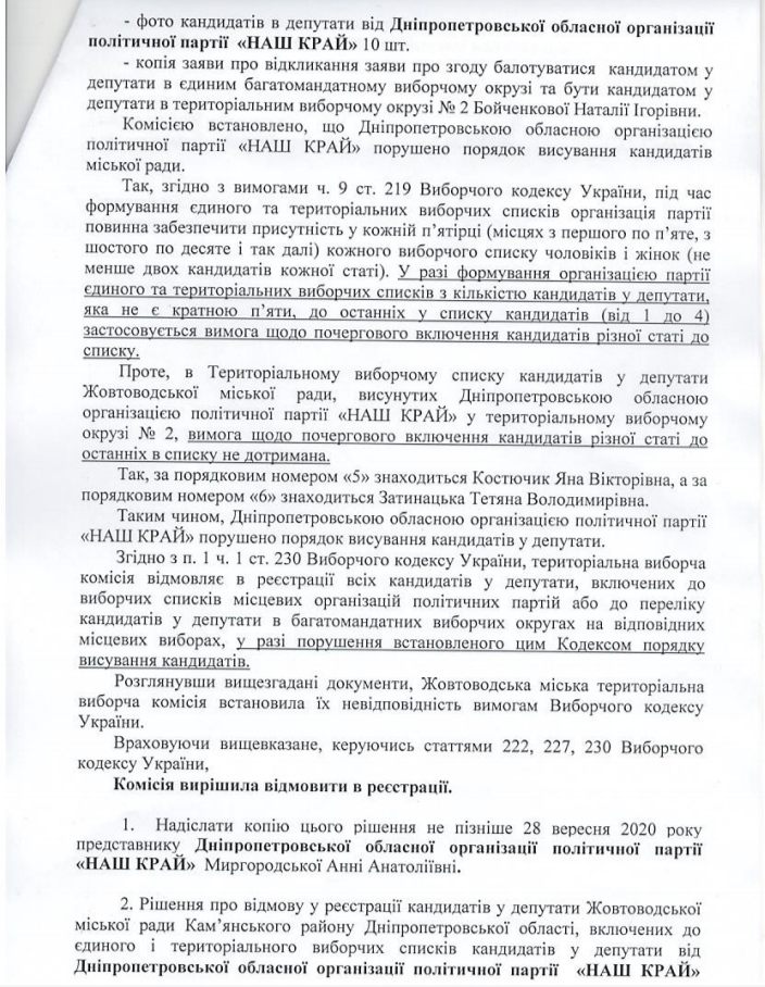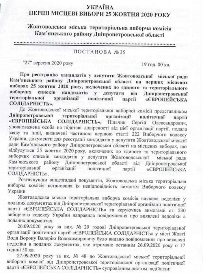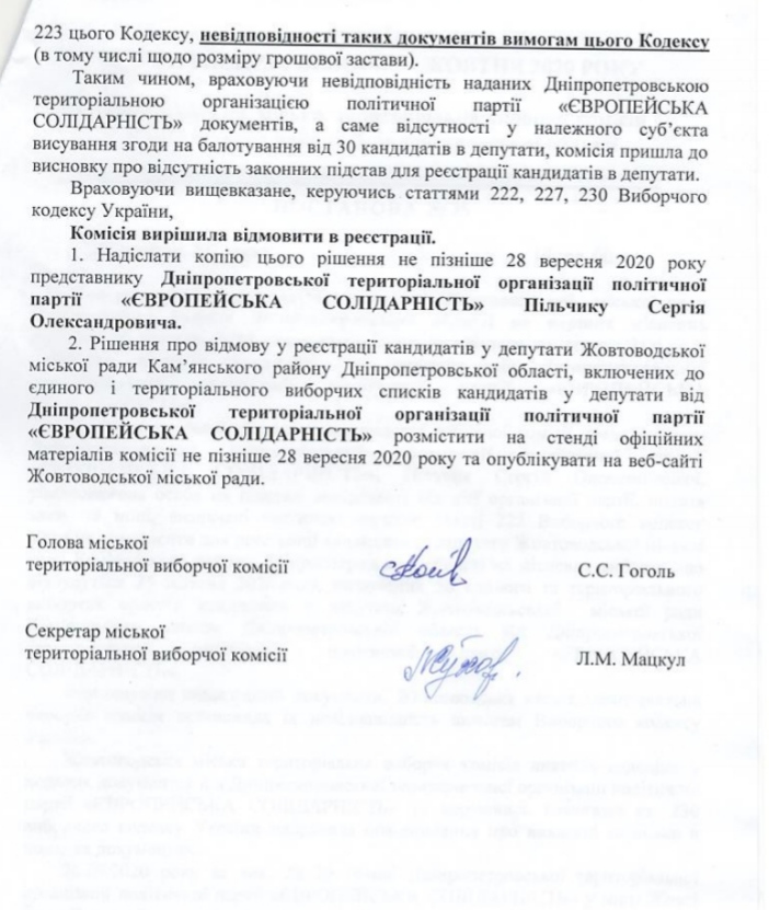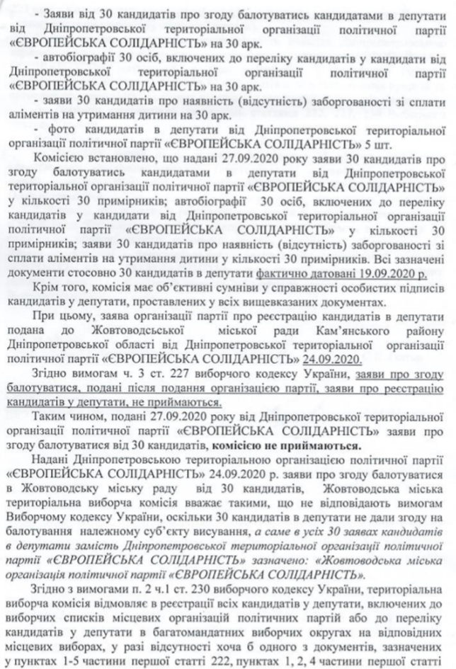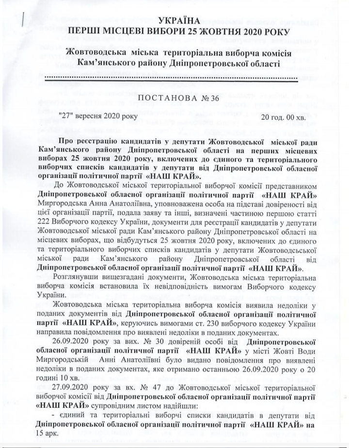 Жовтоводська міська ТВК Кам’янського району відмовила в реєстрації кандидатів у депутати Жовтоводської міської ради Кам'янського району Дніпропетровської області, включених до єдиного і територіального виборчих списків від кандидатів у депутати від Дніпропетровської територіальної організації політичної партії «Європейська солідарність» та Дніпропетровської обласної організації політичної партії «Наш край».
