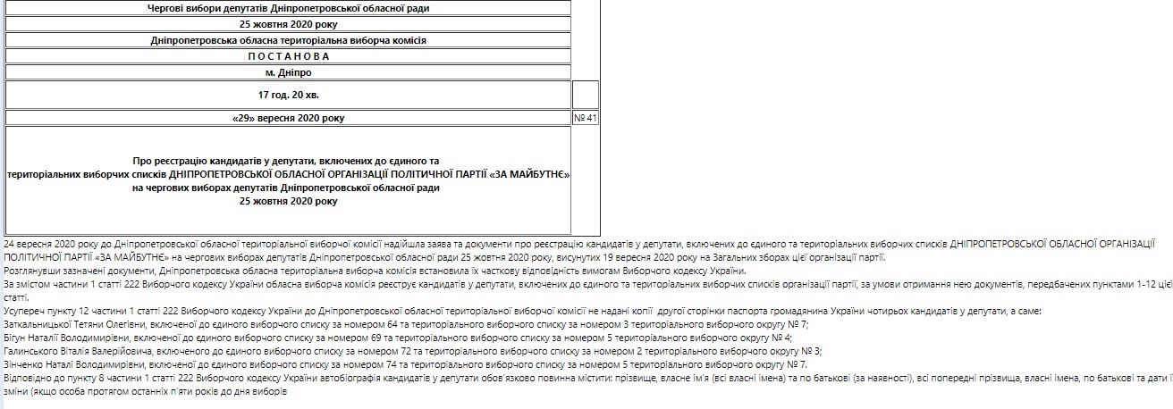 Також не були зареєстровані кандидатами 8 осіб від партії «За майбутнє» через невідповідність поданих документів: не надані копії другої сторінки паспорта громадянина України чотирьох кандидатів у депутати, відсутність в автобіографіях відомостей про партійність, посаду (заняття), місце роботи, наявність чи відсутність представницького мандата.