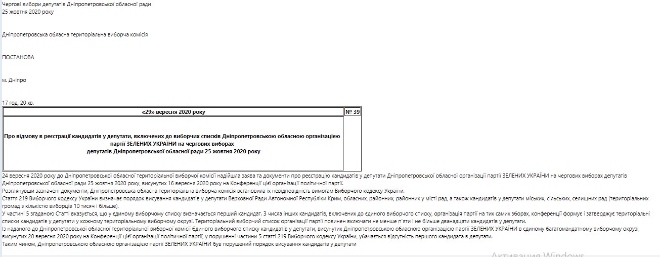 29 вересня на засіданні Дніпропетровської обласної ТВК було відмовлено у реєстрації кандидатів у депутати до Дніпропетровської обласної ради від «Партії Зелених України» через невідповідність документів: відсутність першого кандидата в депутати у єдиному виборчому списку, згоду балотуватися кандидатами у депутати від Дніпропетровської обласної організації «Партії Зелених України» не надано 62 кандидатами у депутати.