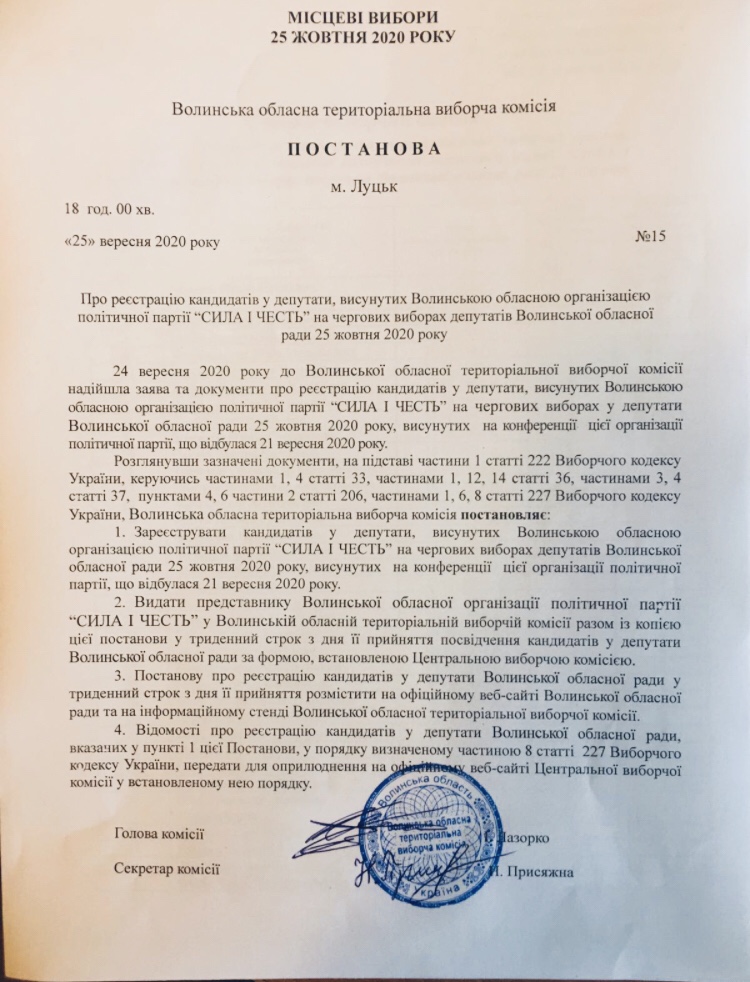 До єдиного виборчого списку кандидатів до Волинської обласної ради від партії «Сила і честь», зареєстрованого відповідно до постанови №15 від 25 вересня, включено 58 кандидатів. Першим номером став Роман Карпюк.