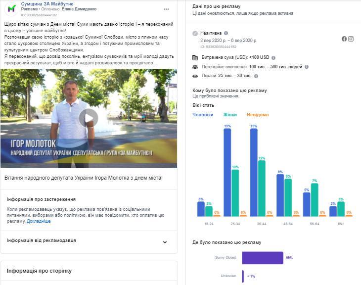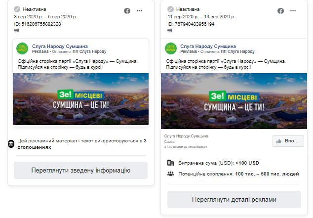 Офіційна сторінка Слуга народу Сумщина рекламувала 2 пости. На рекламу кожного з них витратили близько 100 американських доларів. Два ідентичні дописи рекламують сторінку з закликом підписатись: «Офіційна сторінка партії «Слуга народу» — Сумщина. Підписуйся на сторінку — будь в курсі!».