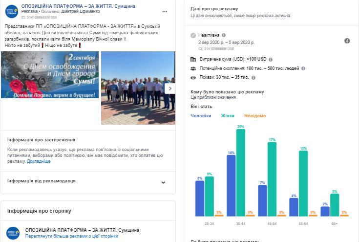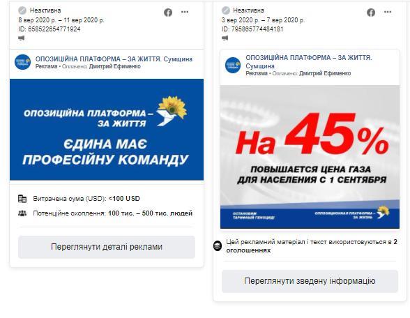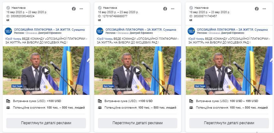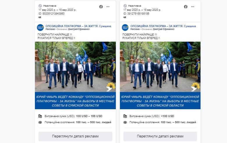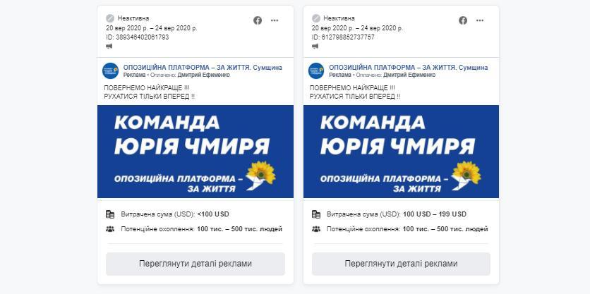 Протягом вересня сторінка Опозиційна платформа за життя. Сумщина просувала загалом 9 дописів. Допис про те, що Юрій Чмирь веде «команду «Опозиційної платформи - За життя» на вибори до місцевих рад» рекламувся тричі. На його рекламу витратили близько 400 американських доларів.