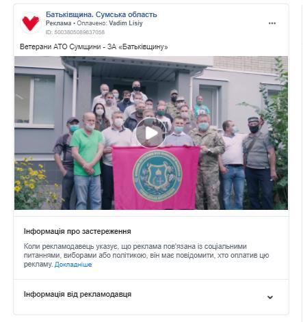 Офіційна сторінка Сумської обласної партійної організації ВО «Батьківщина» Батьківщина Сумська область просувала допис, загальною вартістю до 100 доларів, в ньому йдеться про те, що «Ветерани АТО Сумщини - ЗА «Батьківщину».