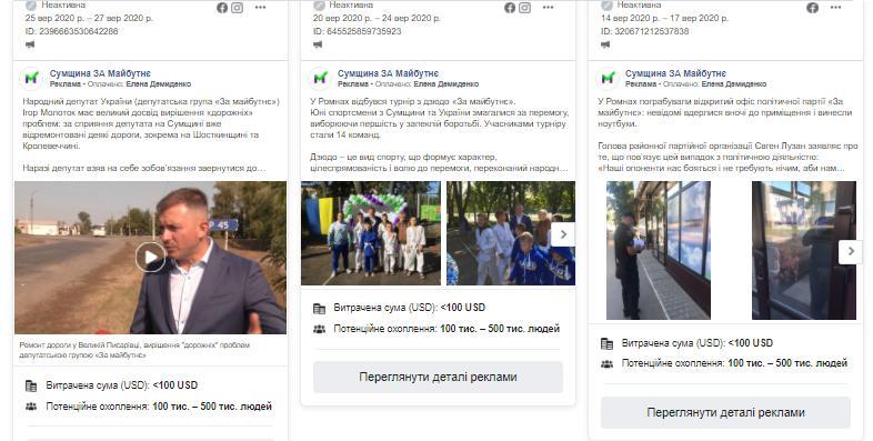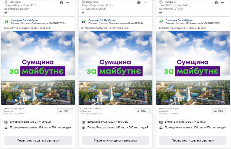 Сторінка «Сумщина ЗА Майбутнє» рекламувала у вересні 17 дописів, що висвітлюють діяльність партії «За майбутнє», пости із заходами, що проводила політична партія, привітання з Днем міста від народного депутата Ігоря Молотка та допис про те, кого партія висунула в кандидати на пост міського голови.